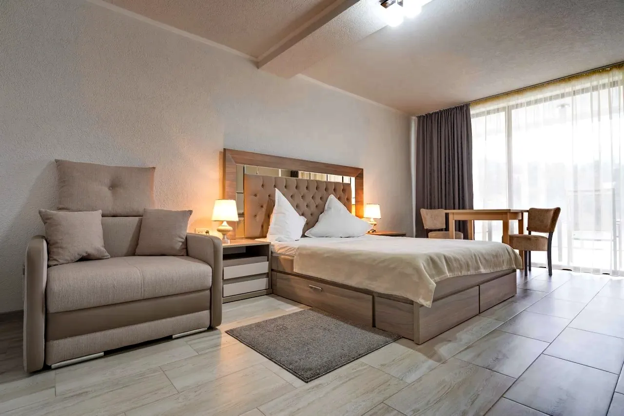 - Au intre 18 si 24 mp si dispun de baie proprie. Paturile sunt matrimoniale sau twin. Fiecare camera are mobilier modern, televizor LCD cu cablu TV, acces internet Wi-Fi gratuit. Baia este echipata modern cu cabina de dus, uscător de par si obiecte sanitare de calitate.