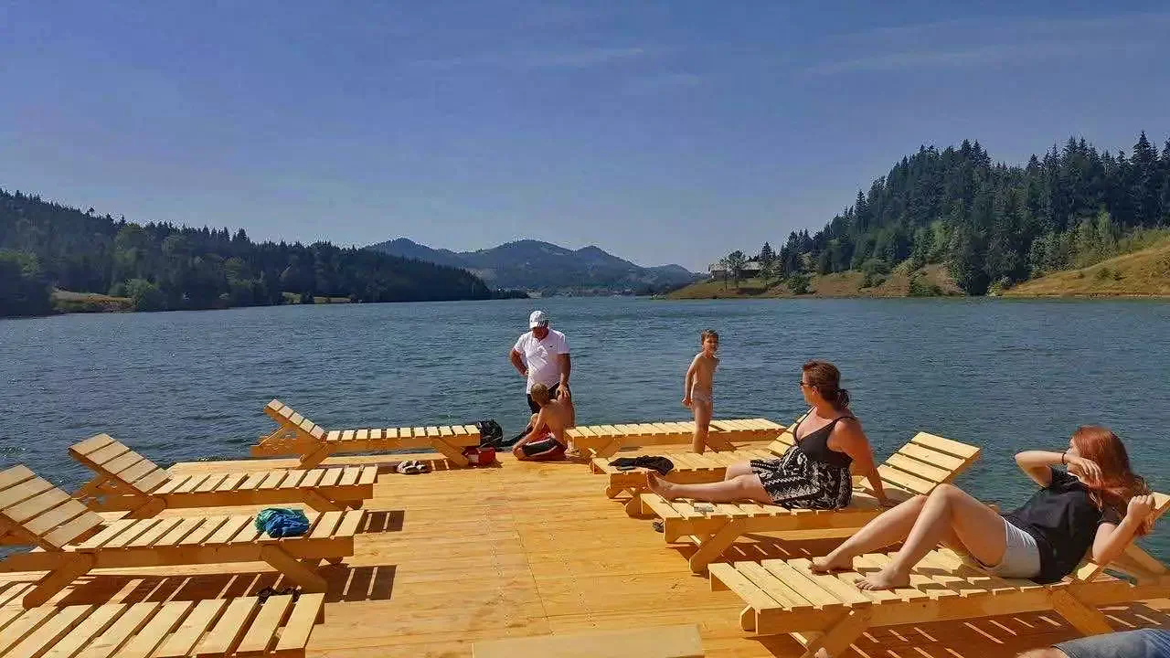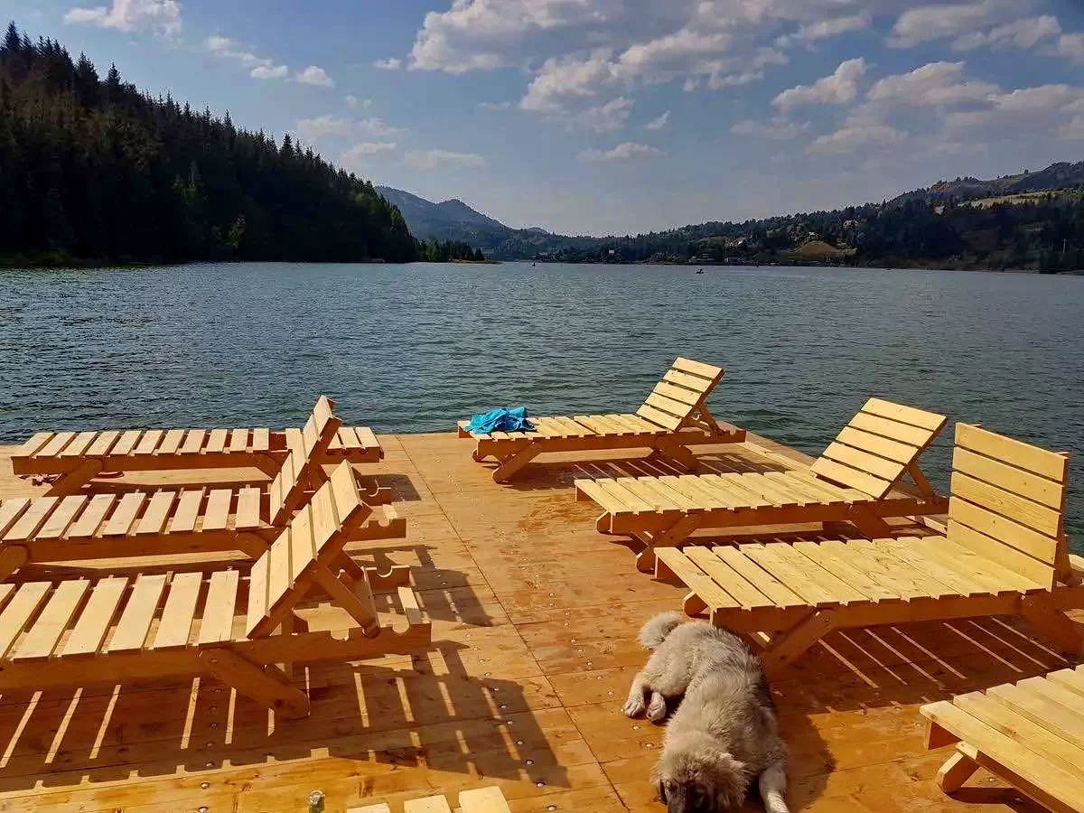 - Pentru oaspeții pensiunii, organizăm, pe timp de vară, plimbări cu pontonul mobil pe Lacul Colibita, o ocazie minunată de a face plajă pe sezlong, sau baie în apa răcoroasă a lacului.