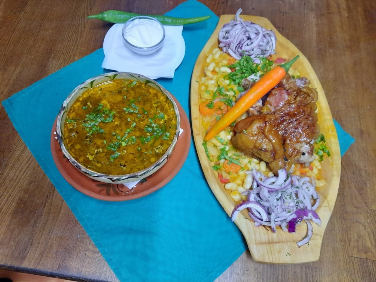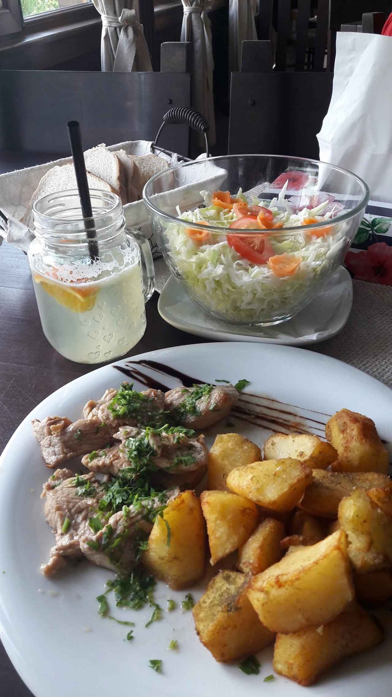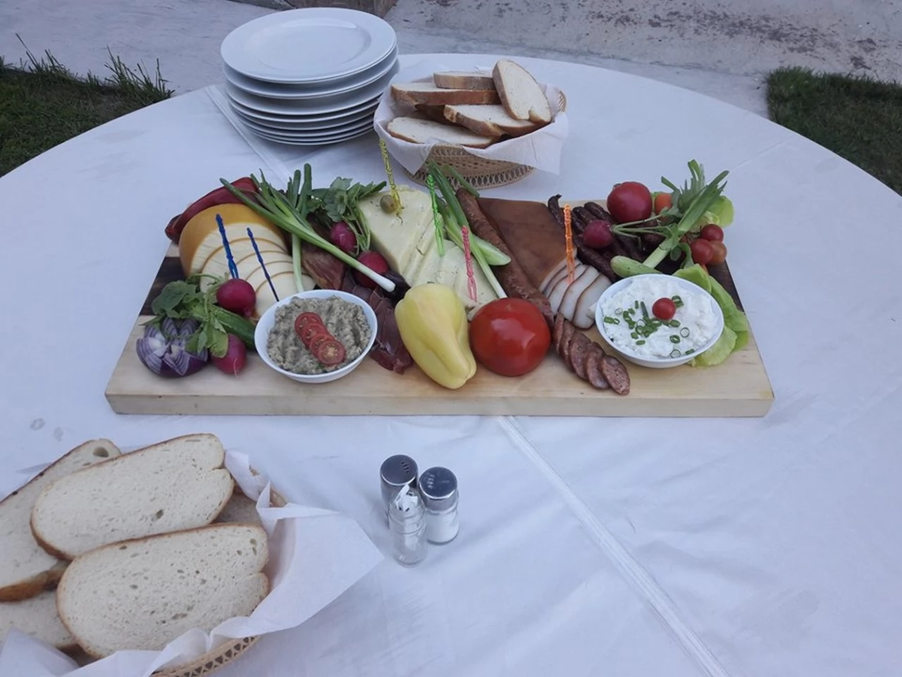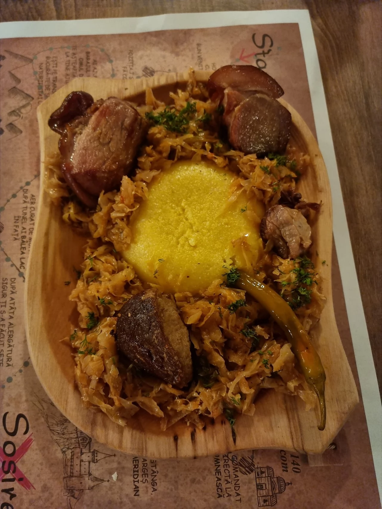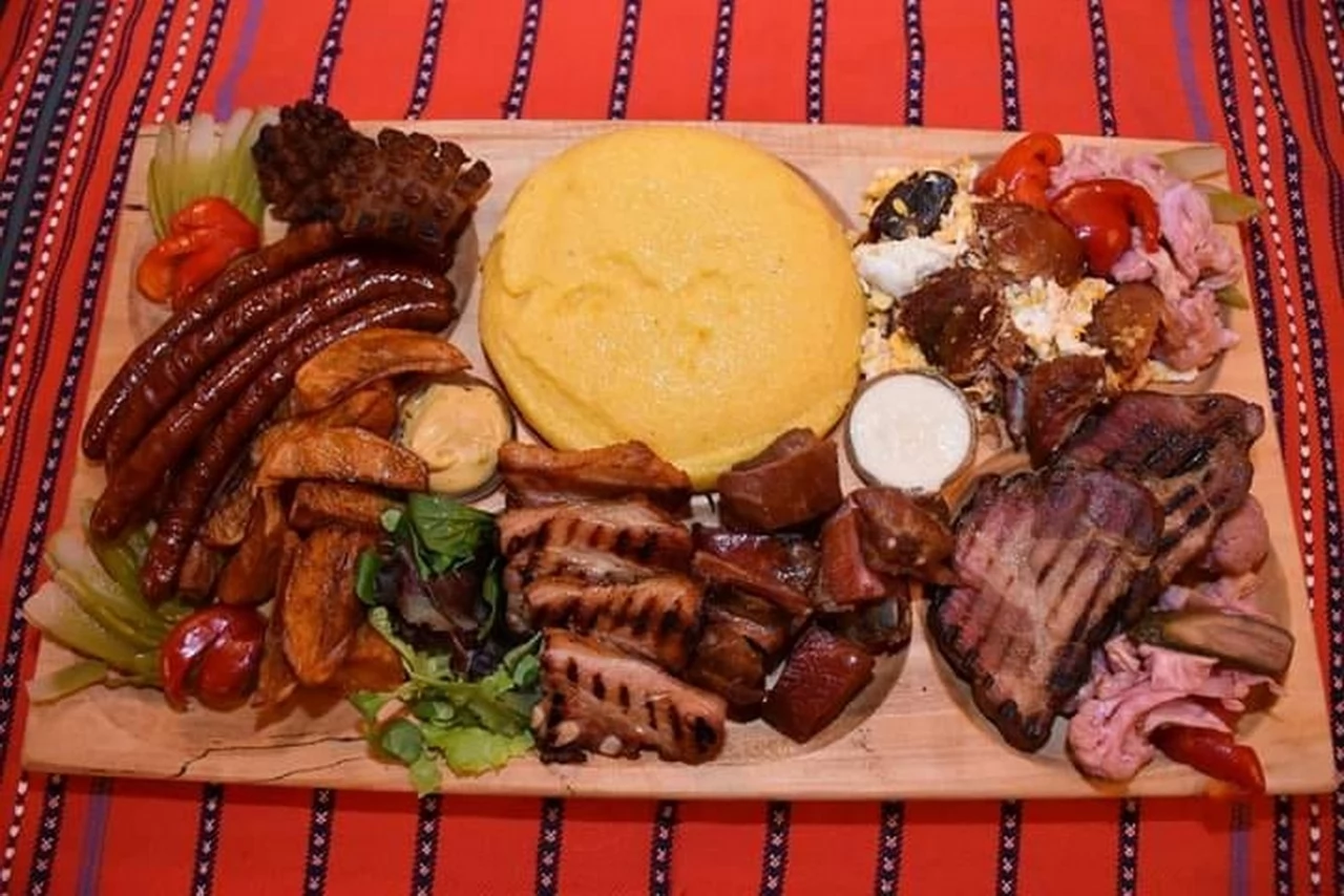 -Pastrama de oaie, carnati de casa, piept de pui, fleica de porc cu cartofi copti si muraturi taranesti