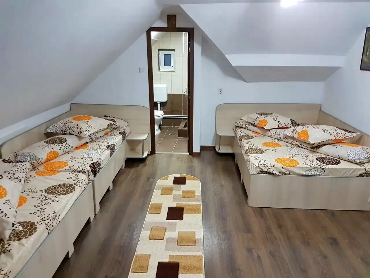 - 1 camera cvadrupla cu baie individuala (un pat matrimonial si 2 paturi simple) cu balcon