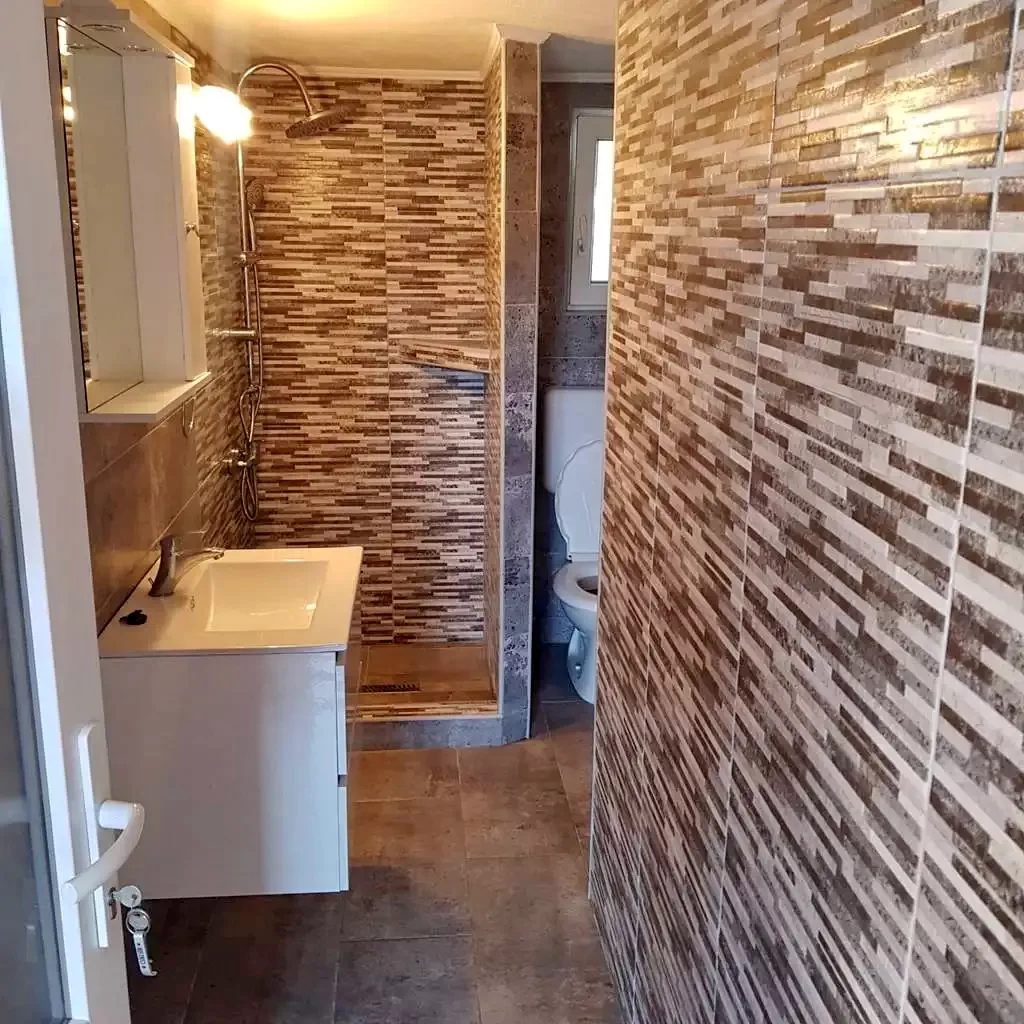 - În prima clădire locuiește proprietarul, iar la etajul acesteia, cu intrare separată, se află 3 dormitoare, fiecare cu baie proprie (unul dintre dormitoare are baie privată internă, iar celelalte două au băi pe hol, în fața camerelor).