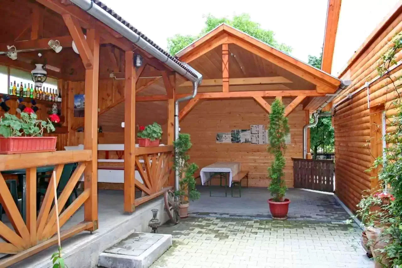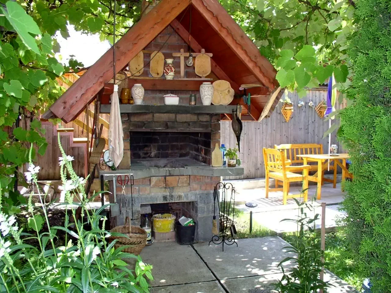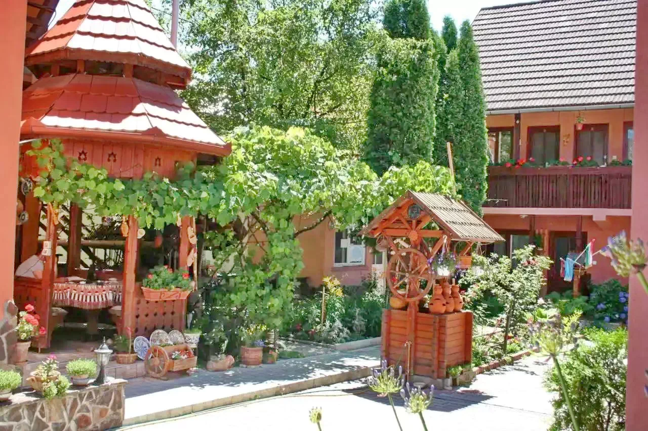 - În curtea amenajată a pensiunii se află o grădină cu iaz ornamental, si oferă facilitați de grătar, ceaun, o bucătărie de vară complet utilată (cu apă constant).