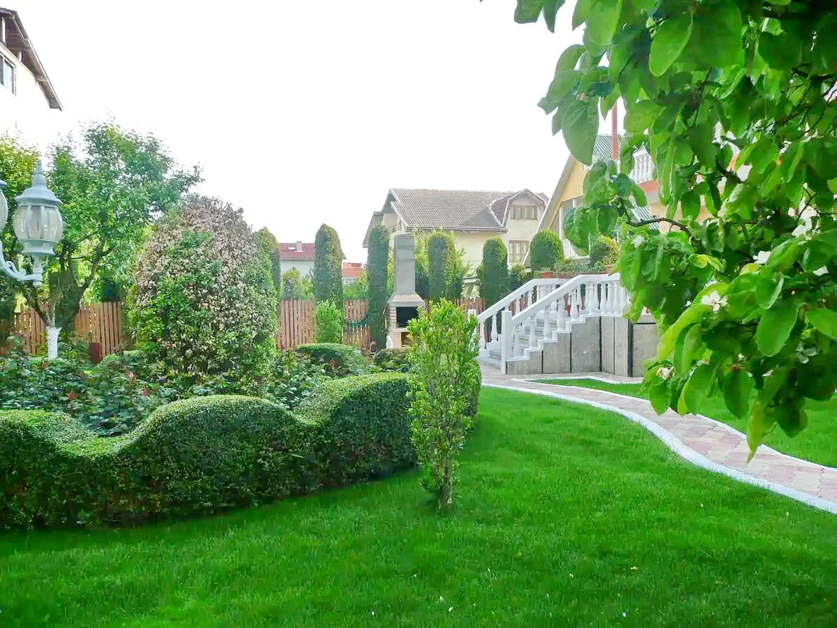 - Gradina cu gazon, pomi fructiferi si confieri, flori viu colorate,
