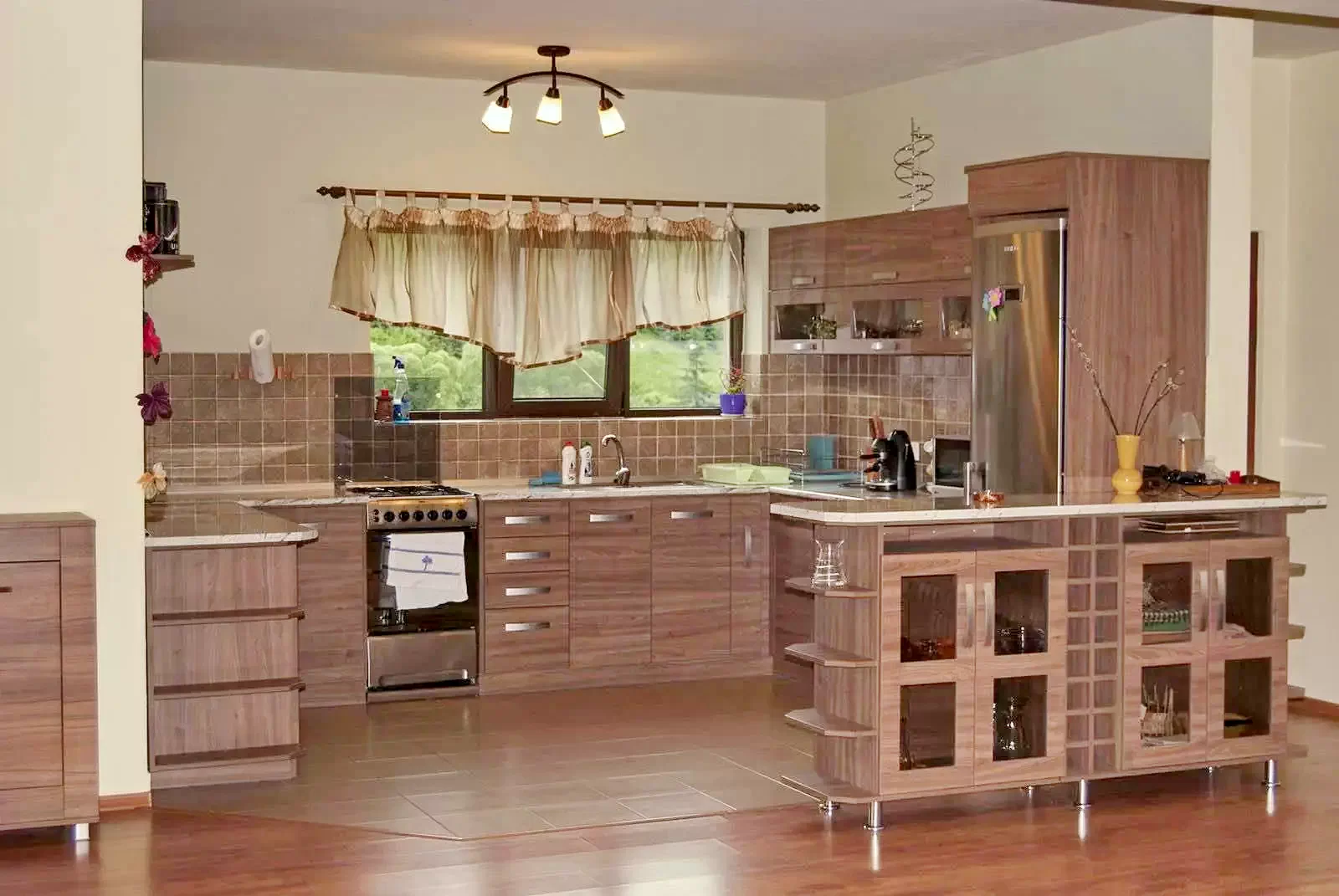 Cabana are o bucătărie frumoasă, modern echipată, și un living extrem de spațios (75 mp).