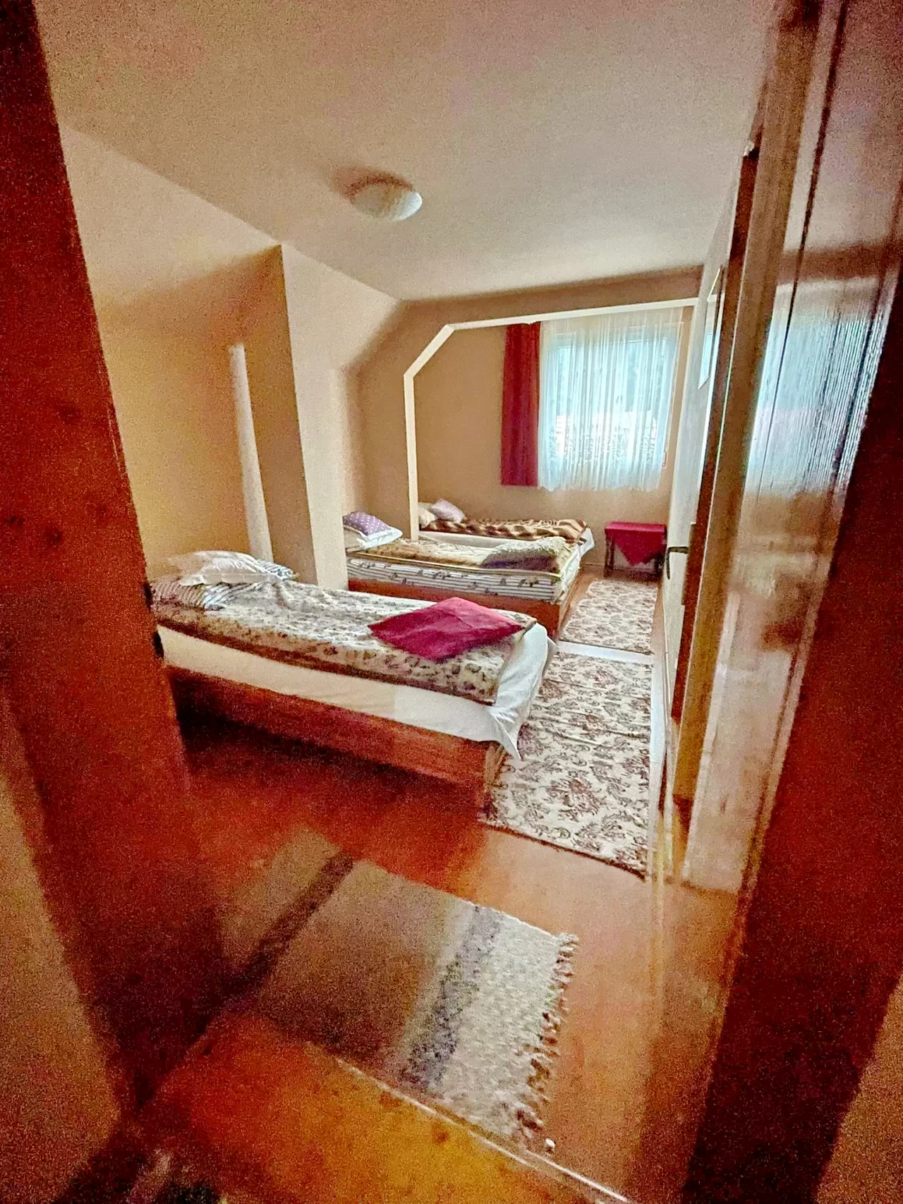 - Etaj: trei camere triple (una cu pat matrimonial și un pat single, una cu pat single și canapea extensibilă, respectiv una cu trei paturi single), plus o baie cu duș.