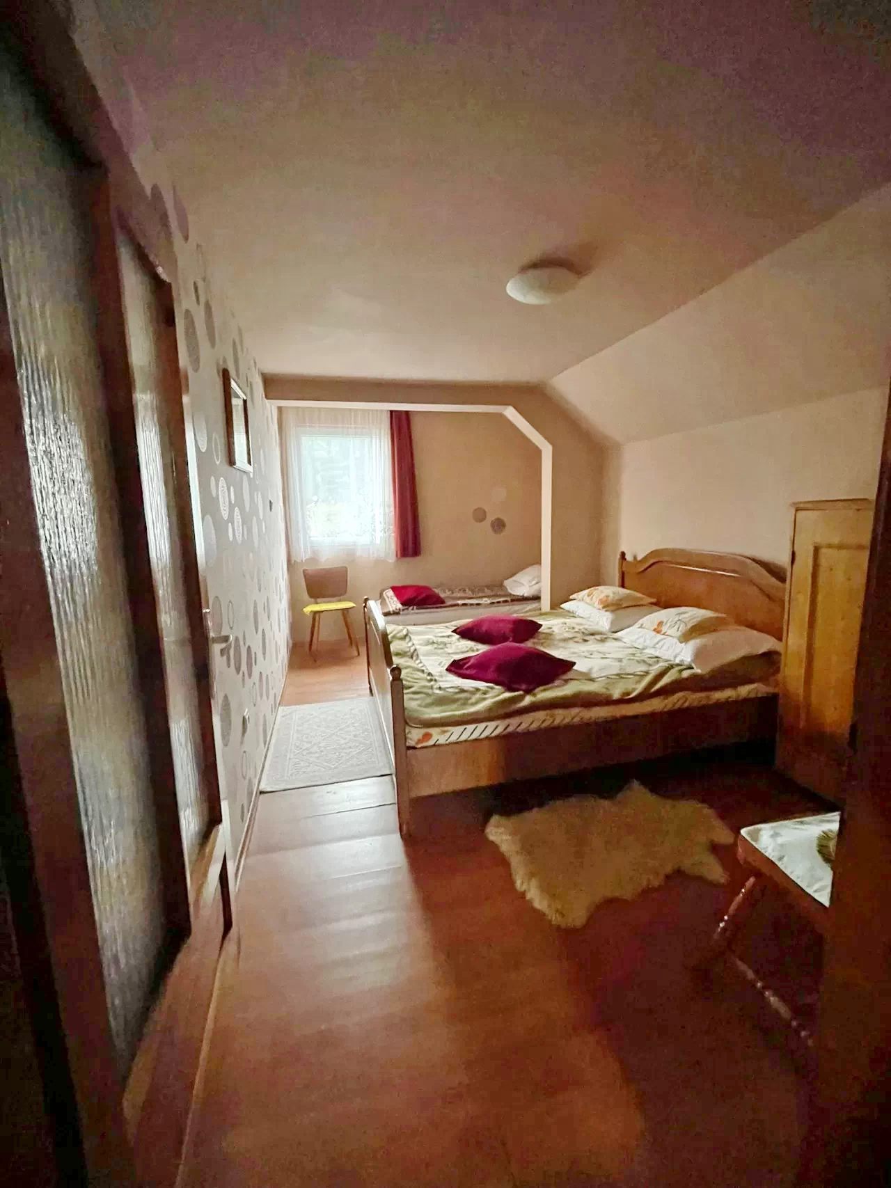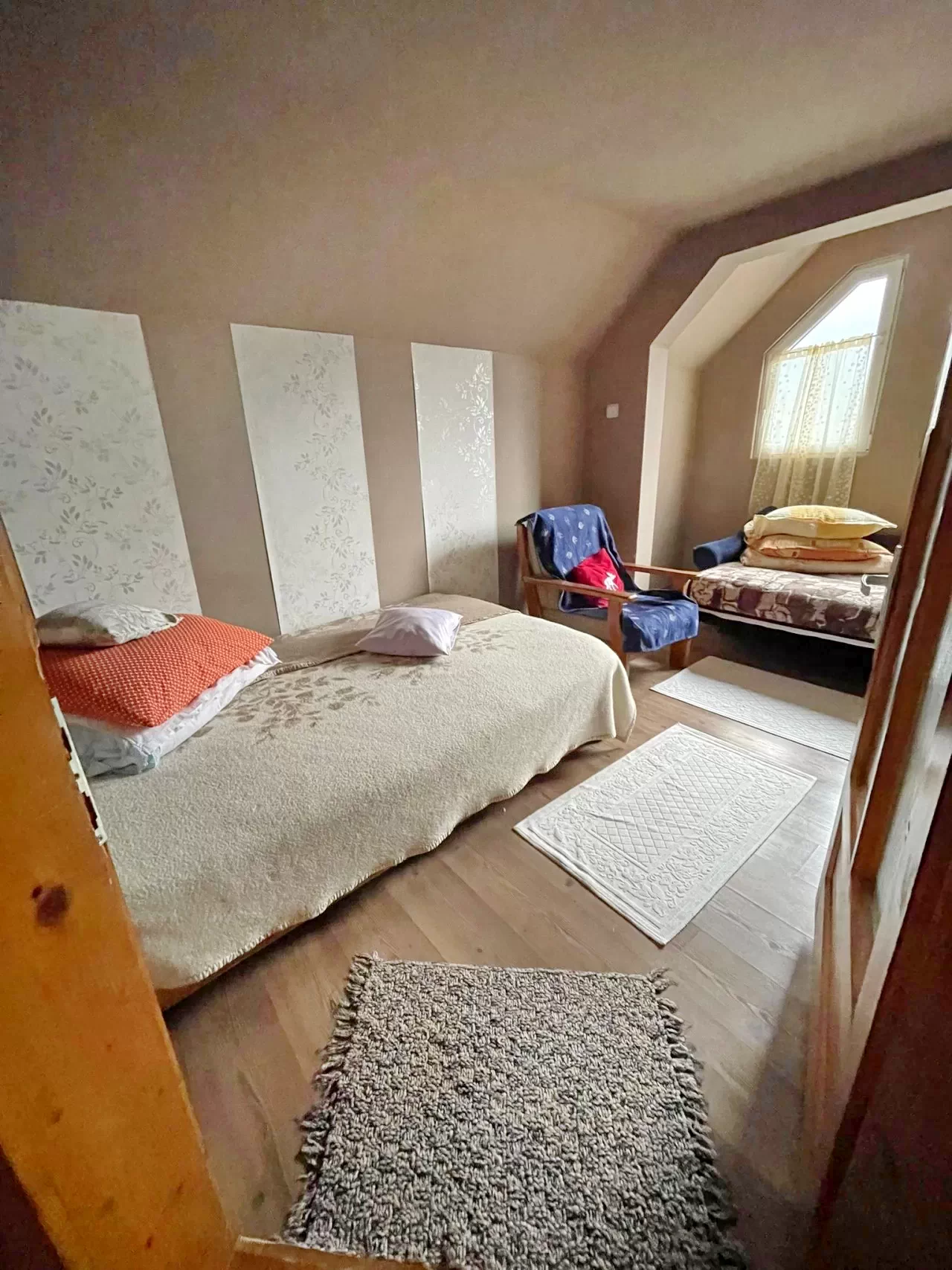- Etaj: trei camere triple (una cu pat matrimonial și un pat single, una cu pat single și canapea extensibilă, respectiv una cu trei paturi single), plus o baie cu duș.