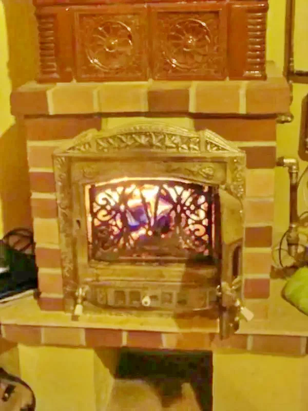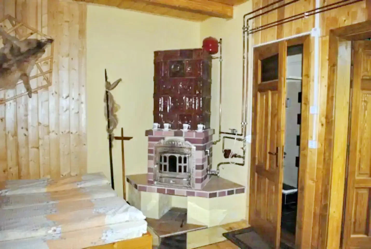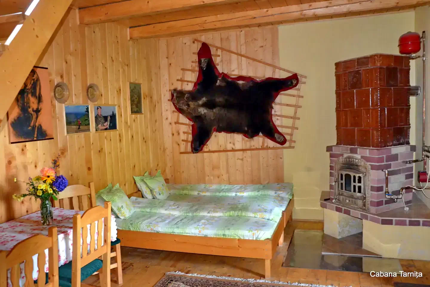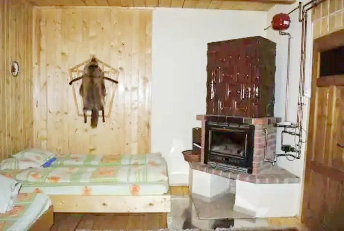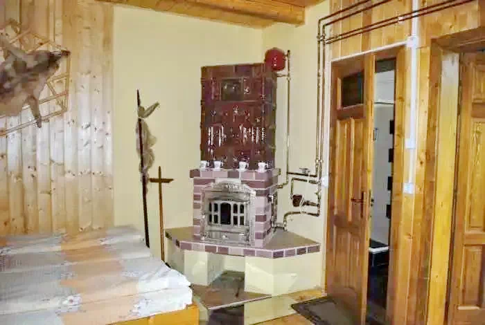 - Living cu sobă de teracotă, pat dublu și pat supraetajat