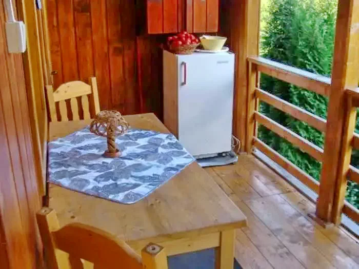 - Terasa mare acoperită (dar nu închisă) cu o chicinetă (aragaz, frigider, grătar, există oale și tacâmuri pentru gătit)