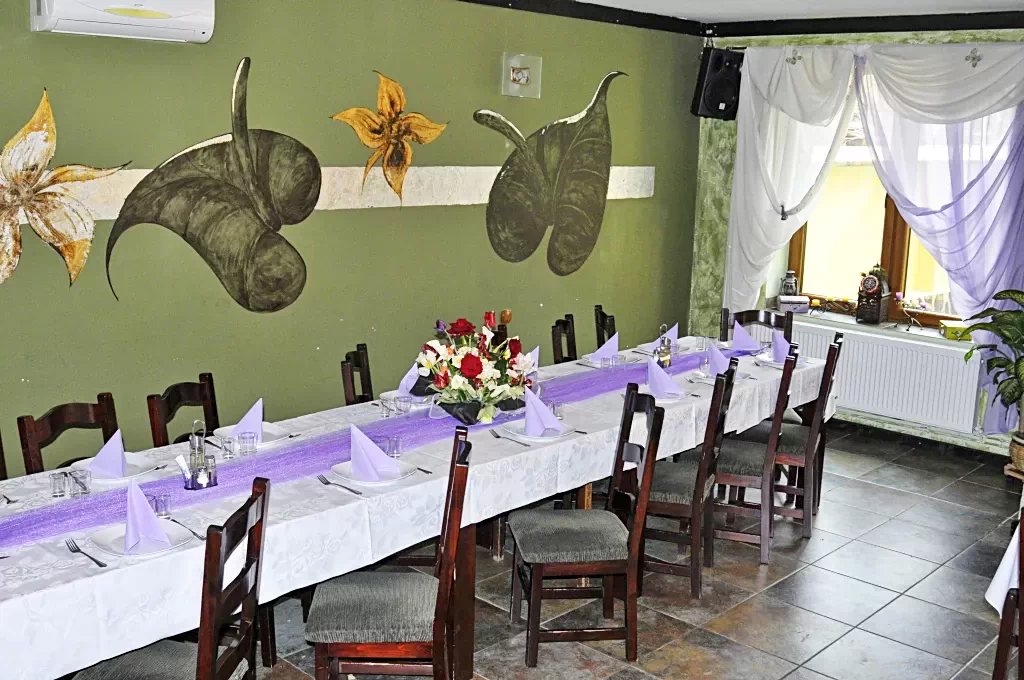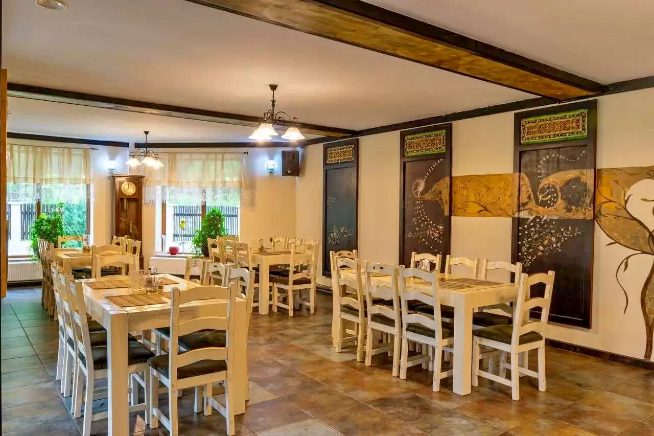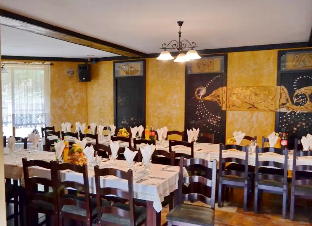 La parterul pensiunii se afla un restaurant mare (aprox. 50 locuri) cu circuit închis, o bucatarie dotata dupa standarde europene în care pregatește bucate traditionale dupa retete din mostenire de familie si o sala de conferinte sau club.