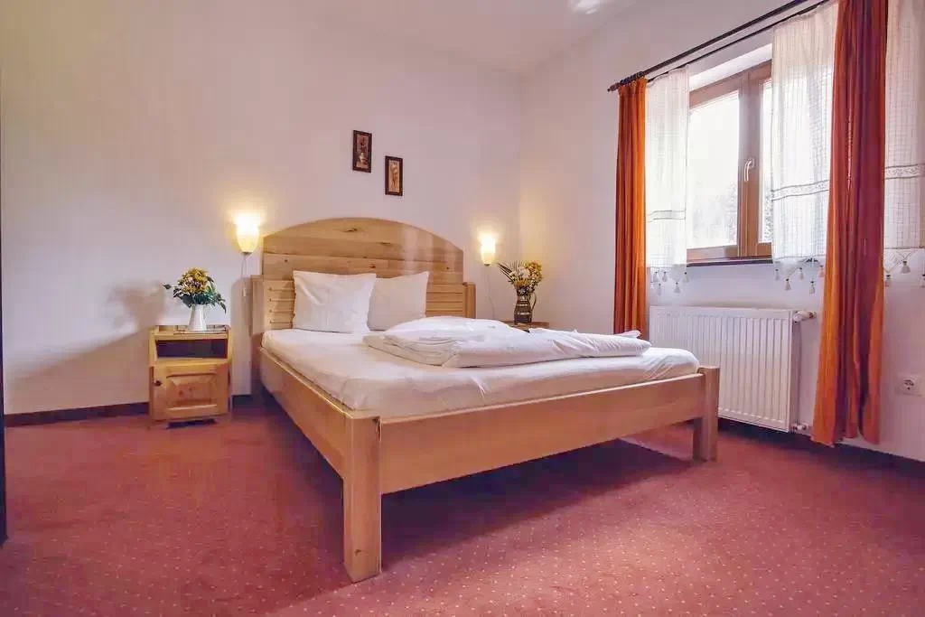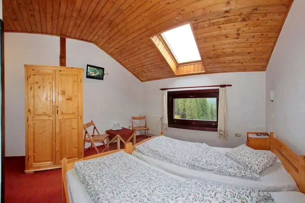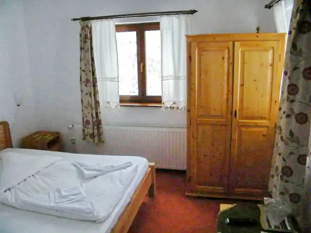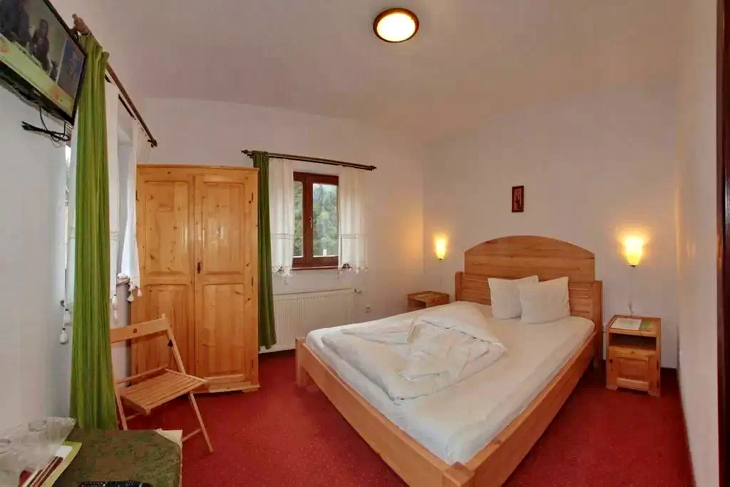- Fiecare cameră este decorată cu bun gust, mobilată cu lemn masiv, dotată cu baie proprie și echipamente moderne. Este un loc ideal pentru a găsi liniște și intimitate, respirând aerul proaspăt și bogat în oxigen al zonei.