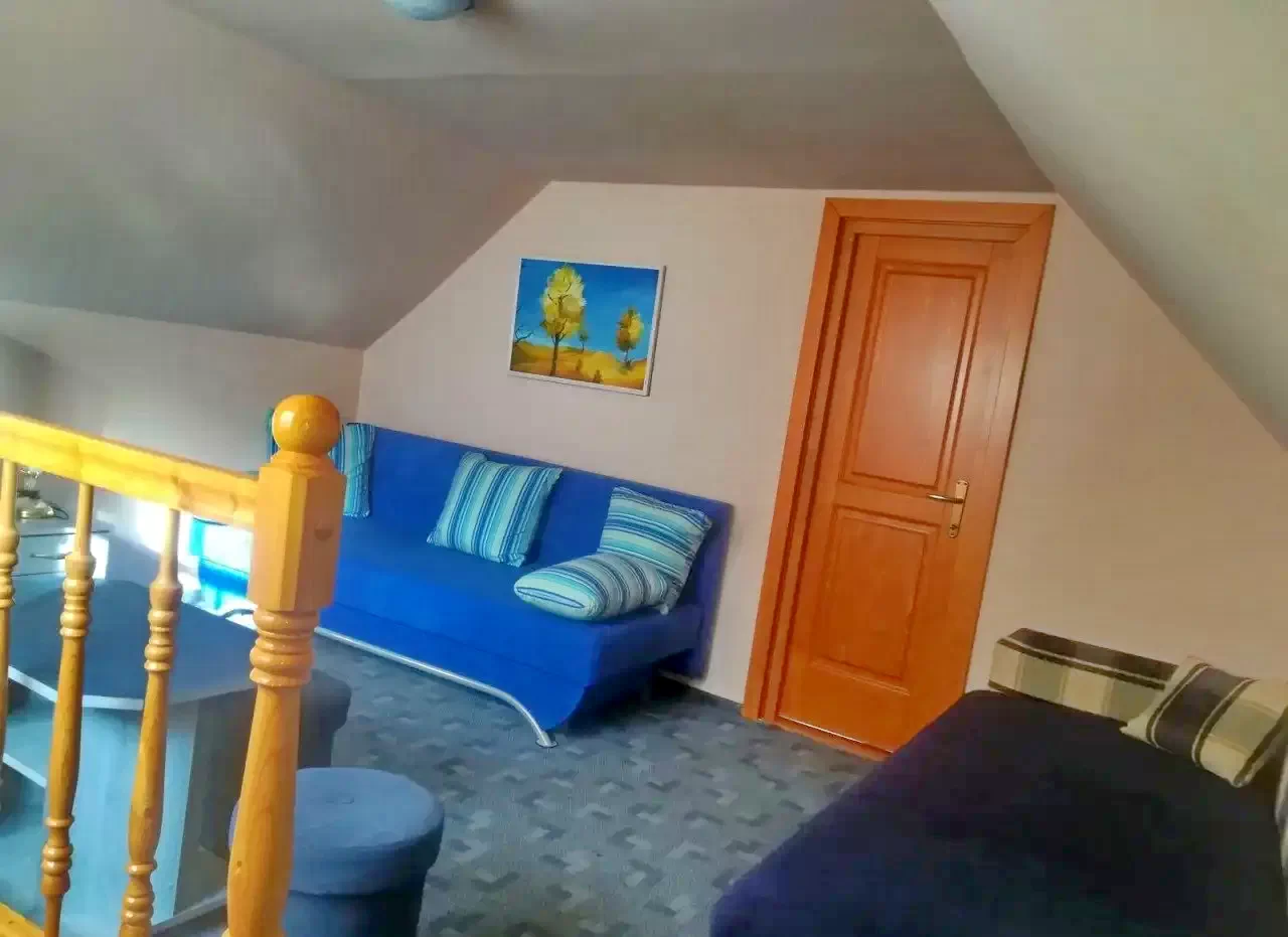 La parter se afla bucataria, baia si camera de zii - sufrageria. La etaj sunt doua camere. Prima camera este dotata cu un pat extensibil (pt. 2 pers.) si un pat simplu. In a doua camera se afla doua paturi extensibile duble. (Mentiune: In camera 2 se ajunge prin camera 1) In total: 5 (+2) persoane!
