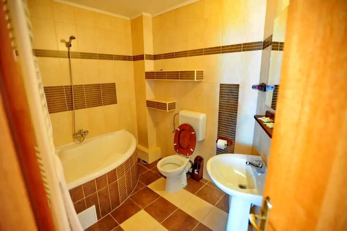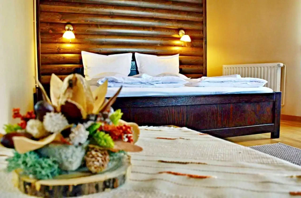 - Atmosfera intimă este completată de mobilierul din lemn masiv, saltelele ortopedice confortabile, lenjeria antialergică, baia proprie dotată cu duș și televizor.
