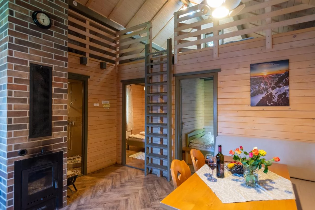 - În living se află un colț de relaxare și o zonă de luat masa, dotată cu șemineu, care oferă o atmosferă plăcută și intimă în serile mai reci.