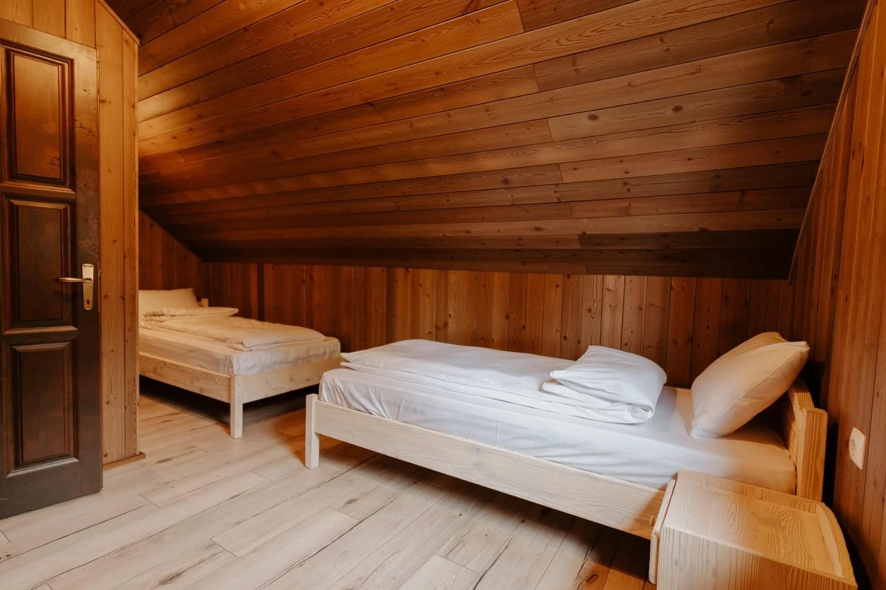 - Etaj: Dormitor cu un pat dublu și două paturi separate, terasă cu vedere panoramică.