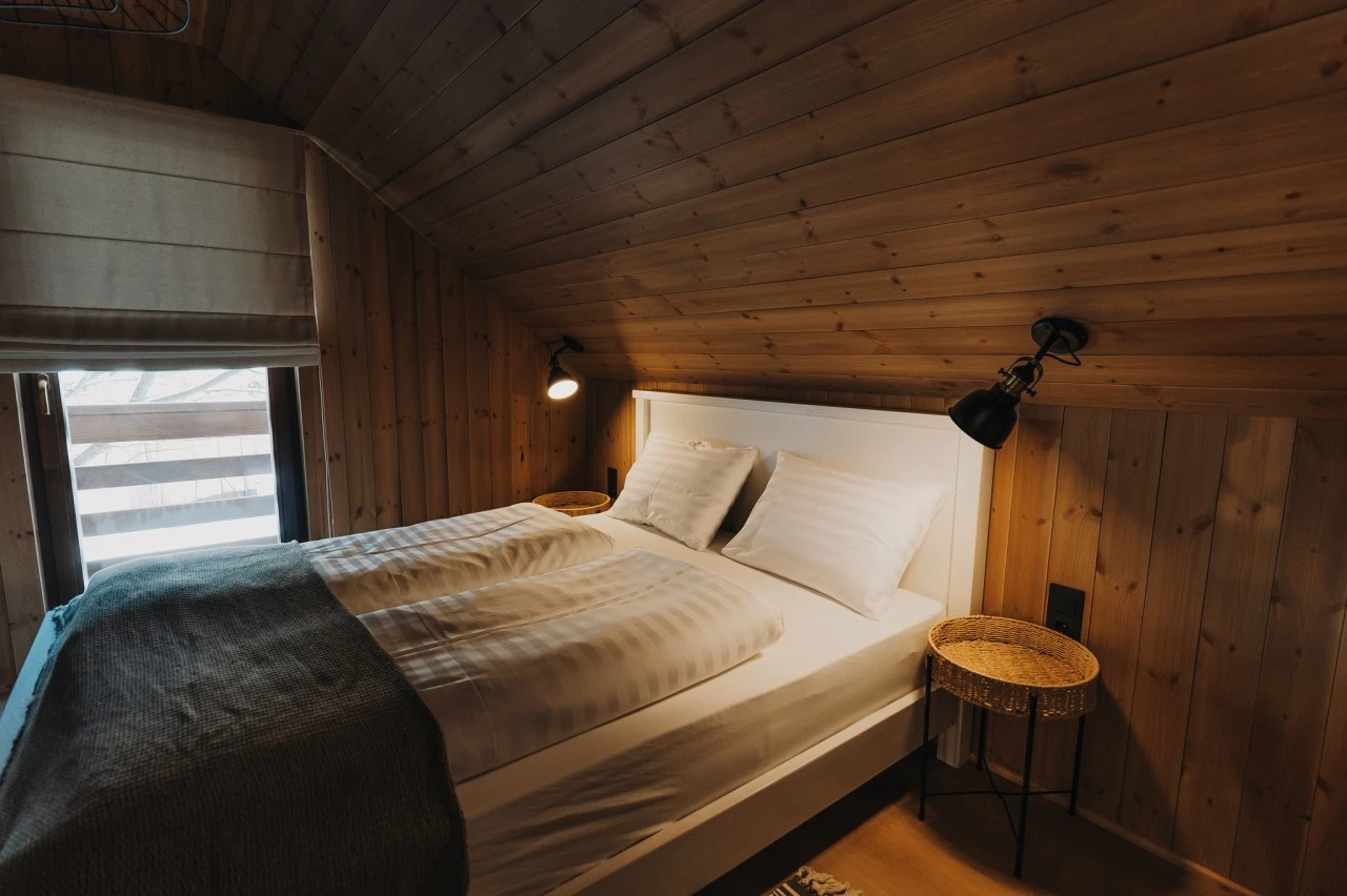 - La parter, apartamentele au un living cu canapea extensibilă, bucătărie și baie, iar la etaj un dormitor cu un pat dublu, două paturi separate și o terasă cu vedere panoramică.