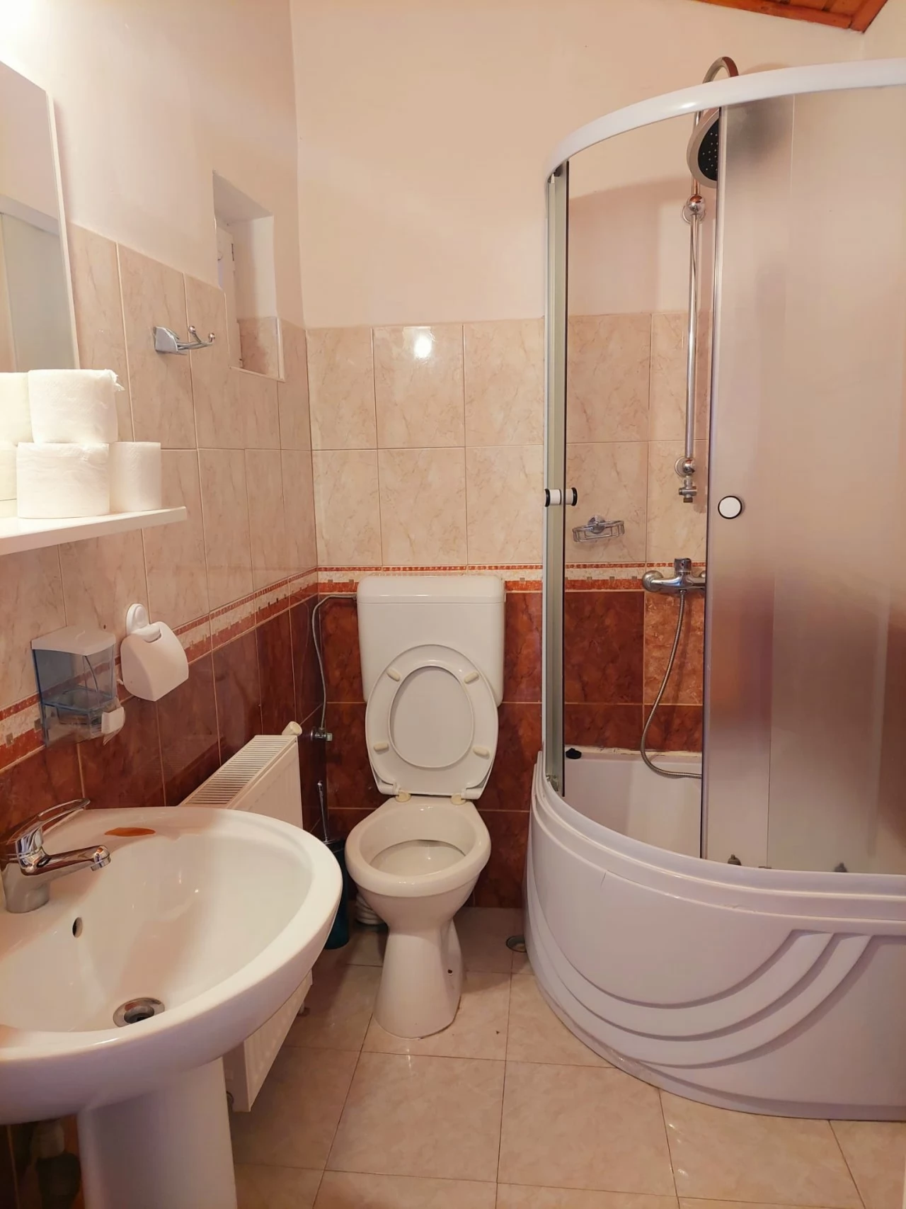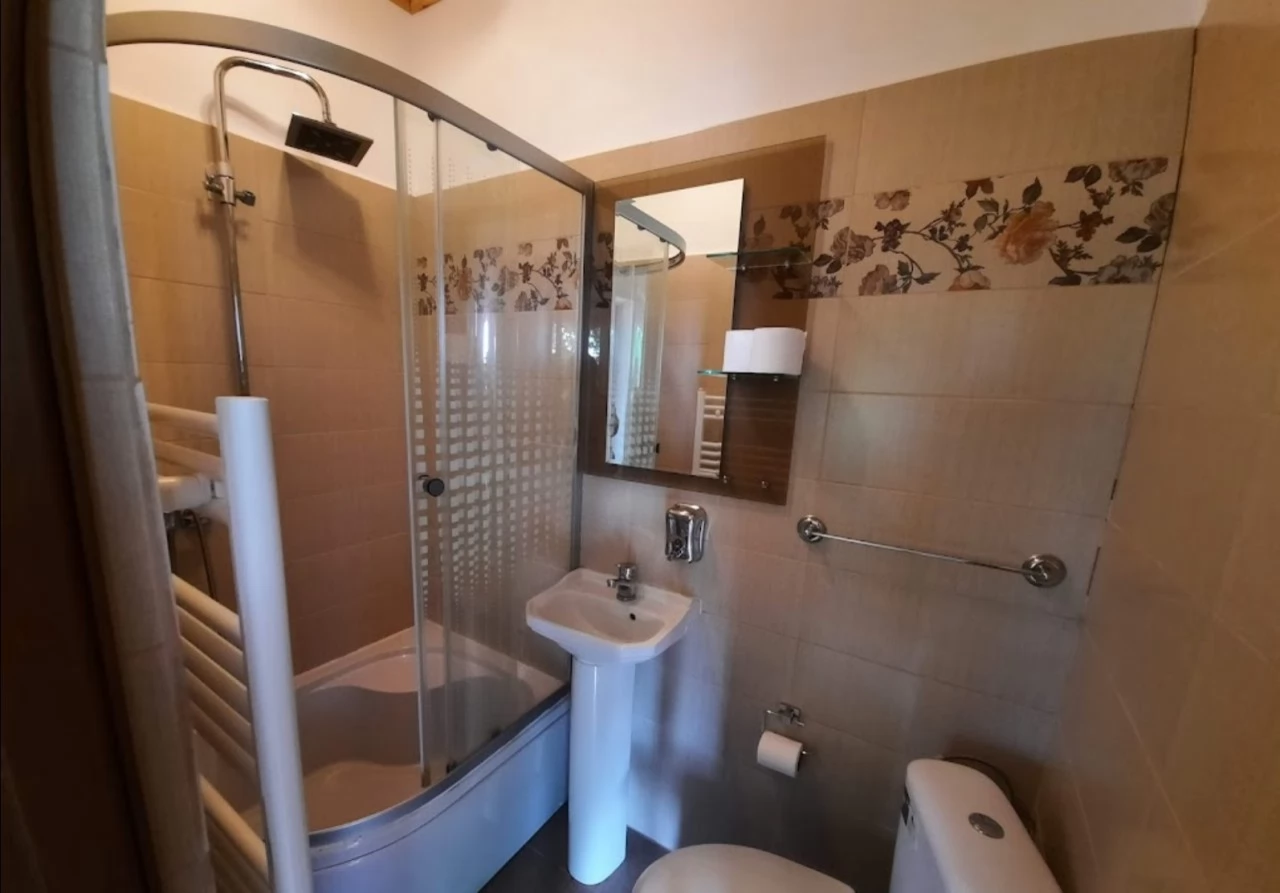 - doua camere double (una cu pat matrimonial si alta cu 2 paturi single) si cu o baie comuna la parter: