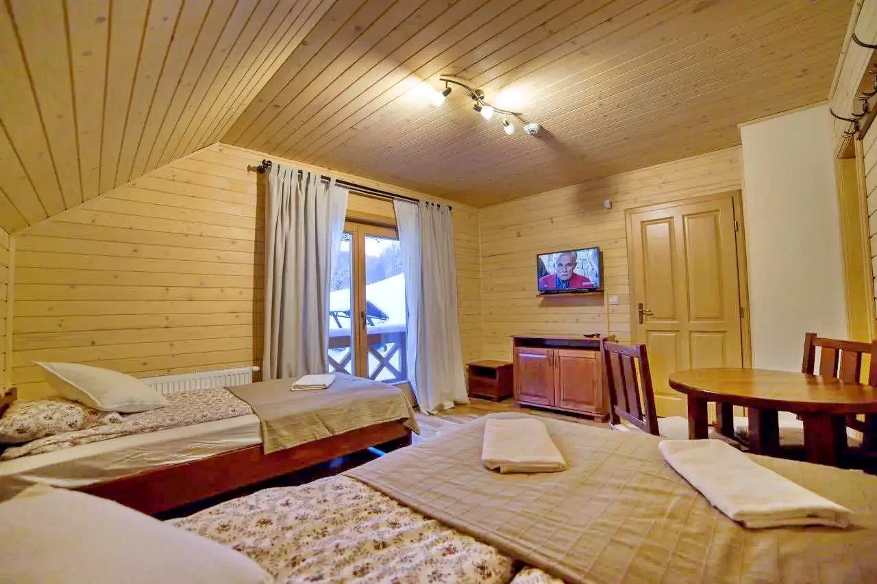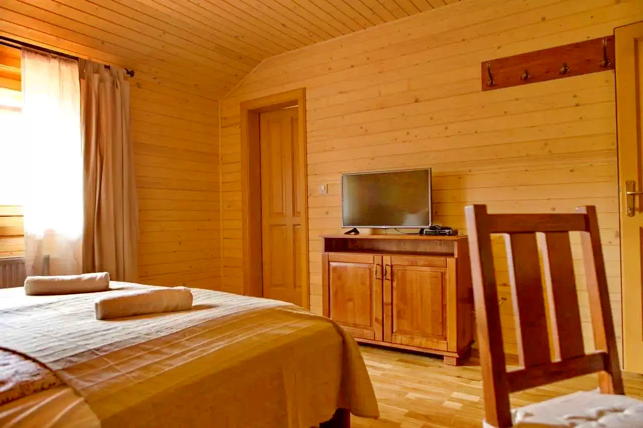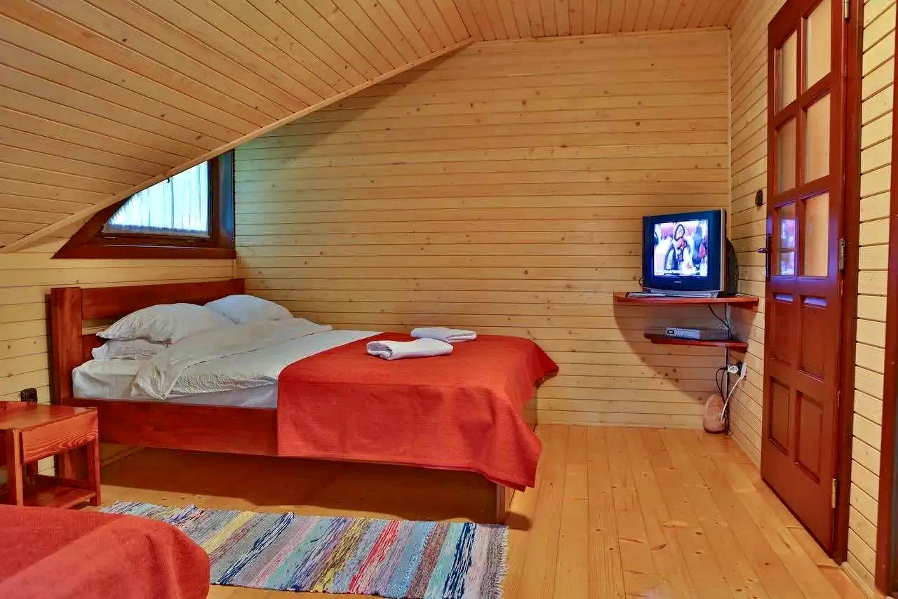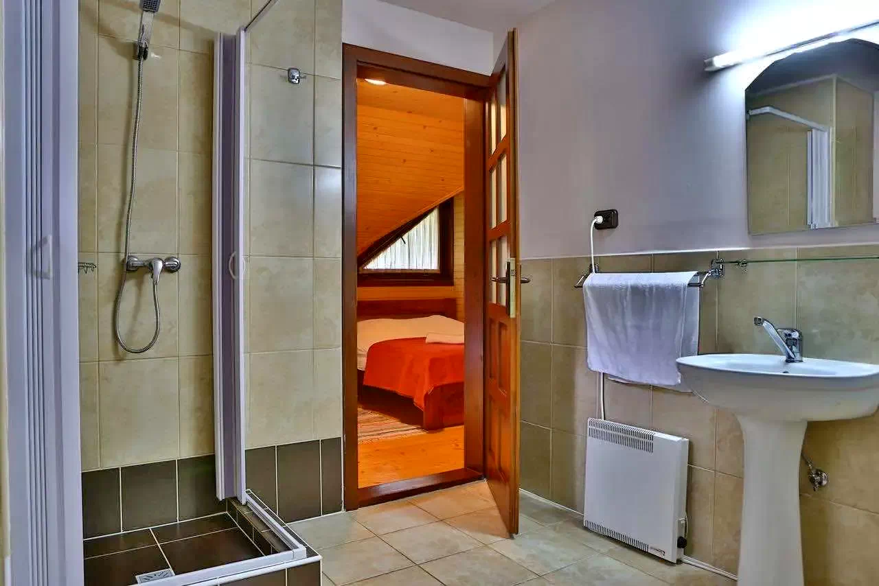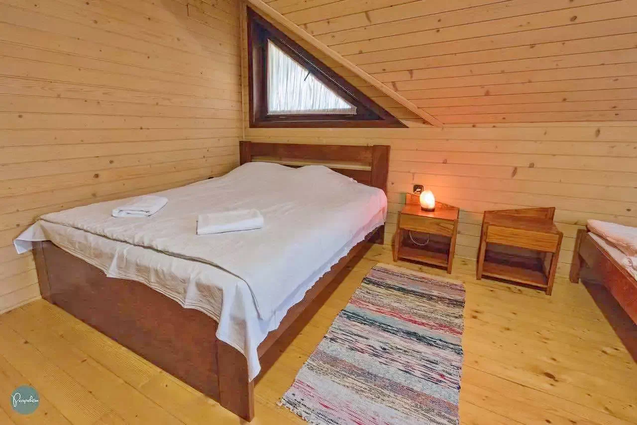 Etaj: 2 camere, fiecare cu 2 paturi duble și baie proprie (cadă cu duș, WC, chiuvetă).