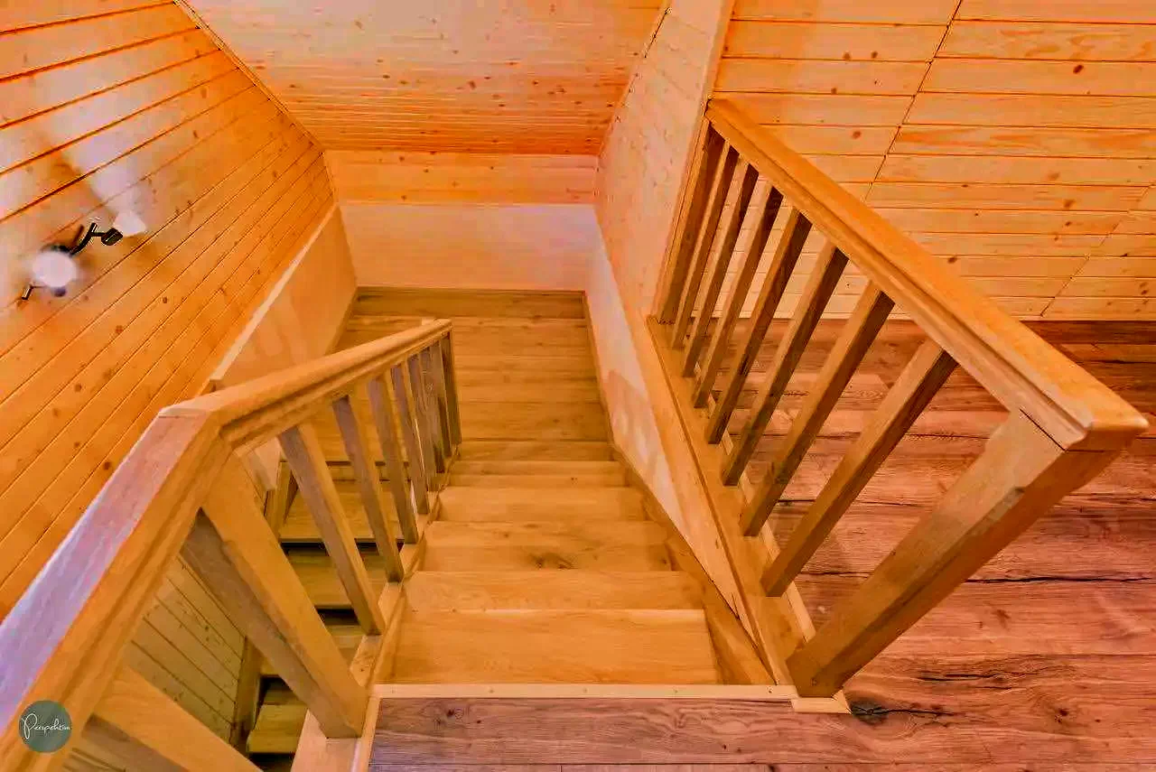 - La etaj, o cameră cu baie proprie (cadă cu duș, WC, chiuvetă) este dotată cu două paturi duble.