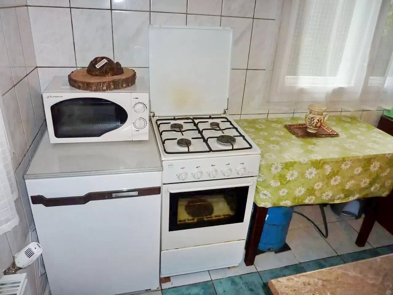 - Bucătăria este complet utilată, cu toate ustensilele necesare pentru autoservire: aragaz pe gaz, frigider, cuptor cu microunde, prăjitor de pâine, aparat de cafea, vase și tacâmuri.