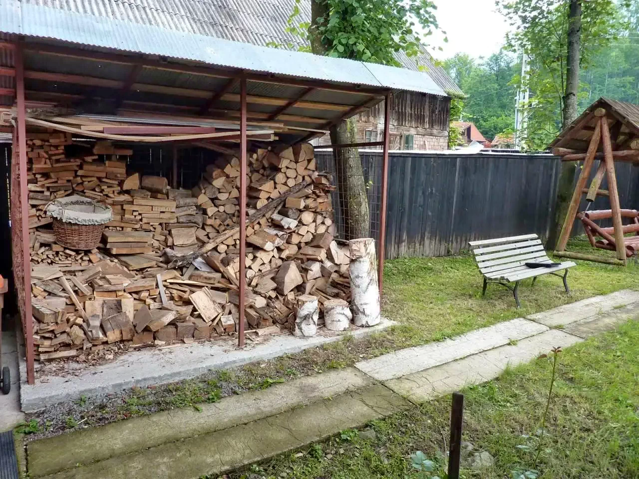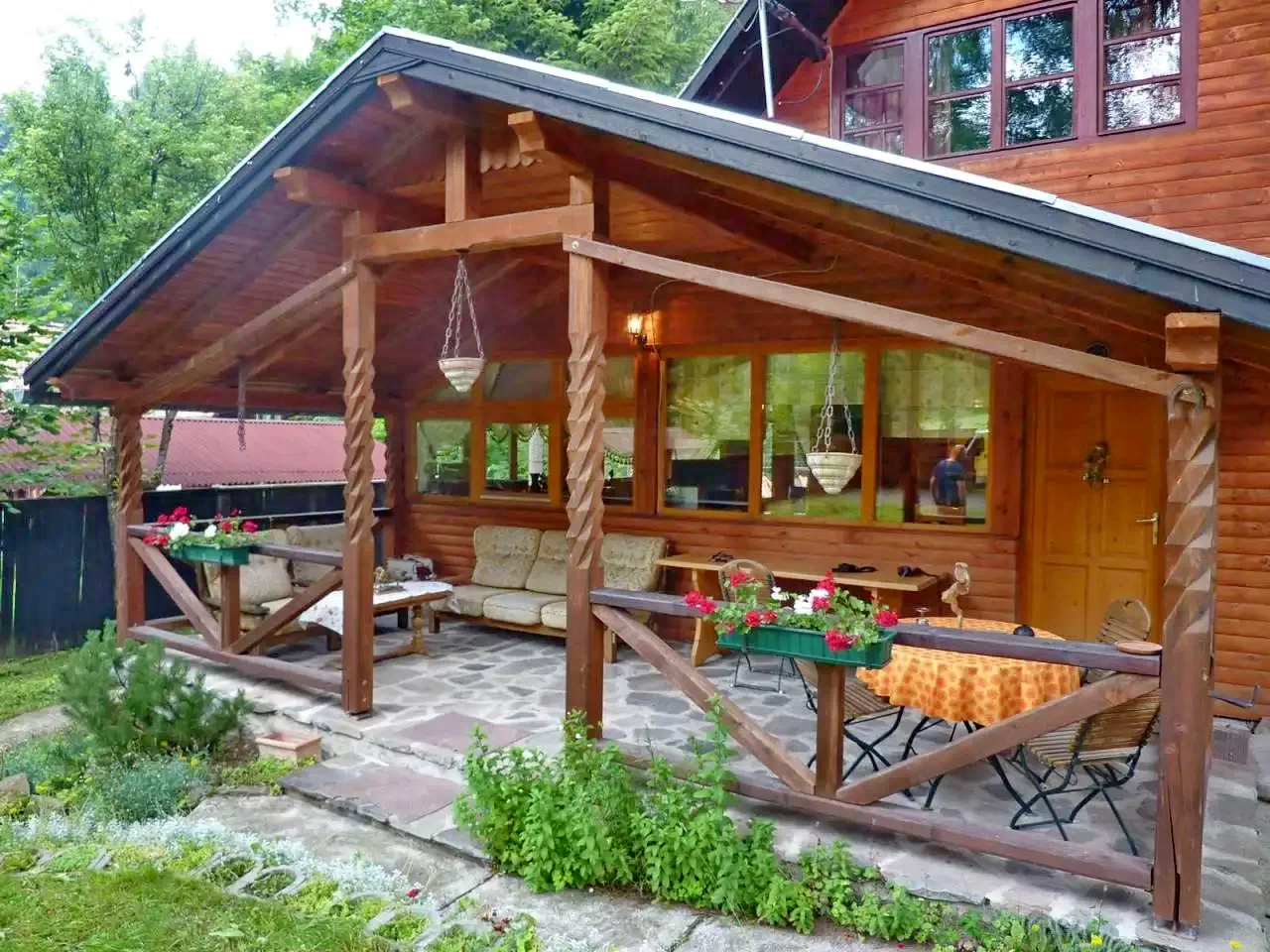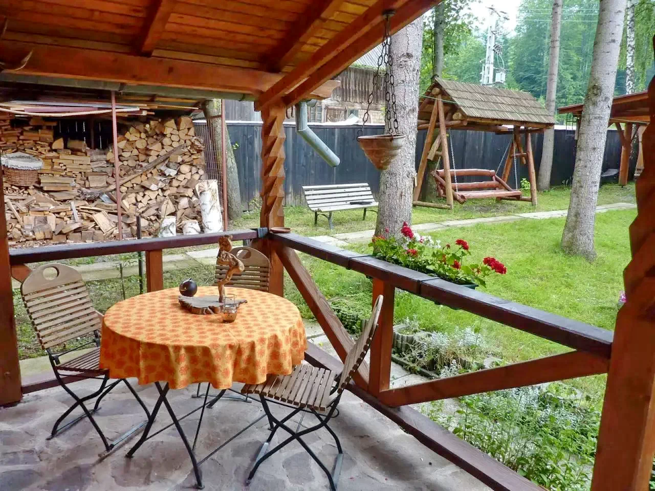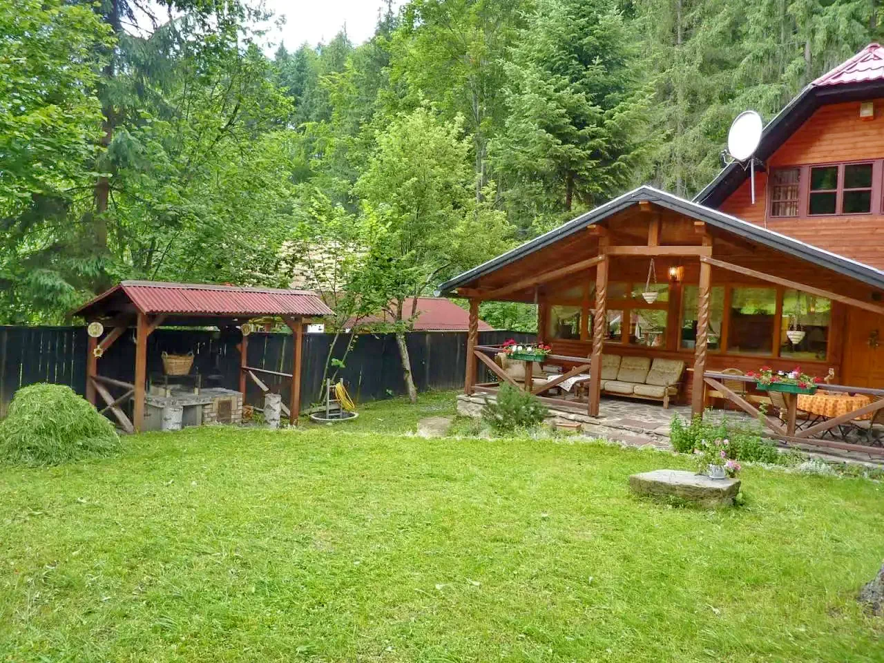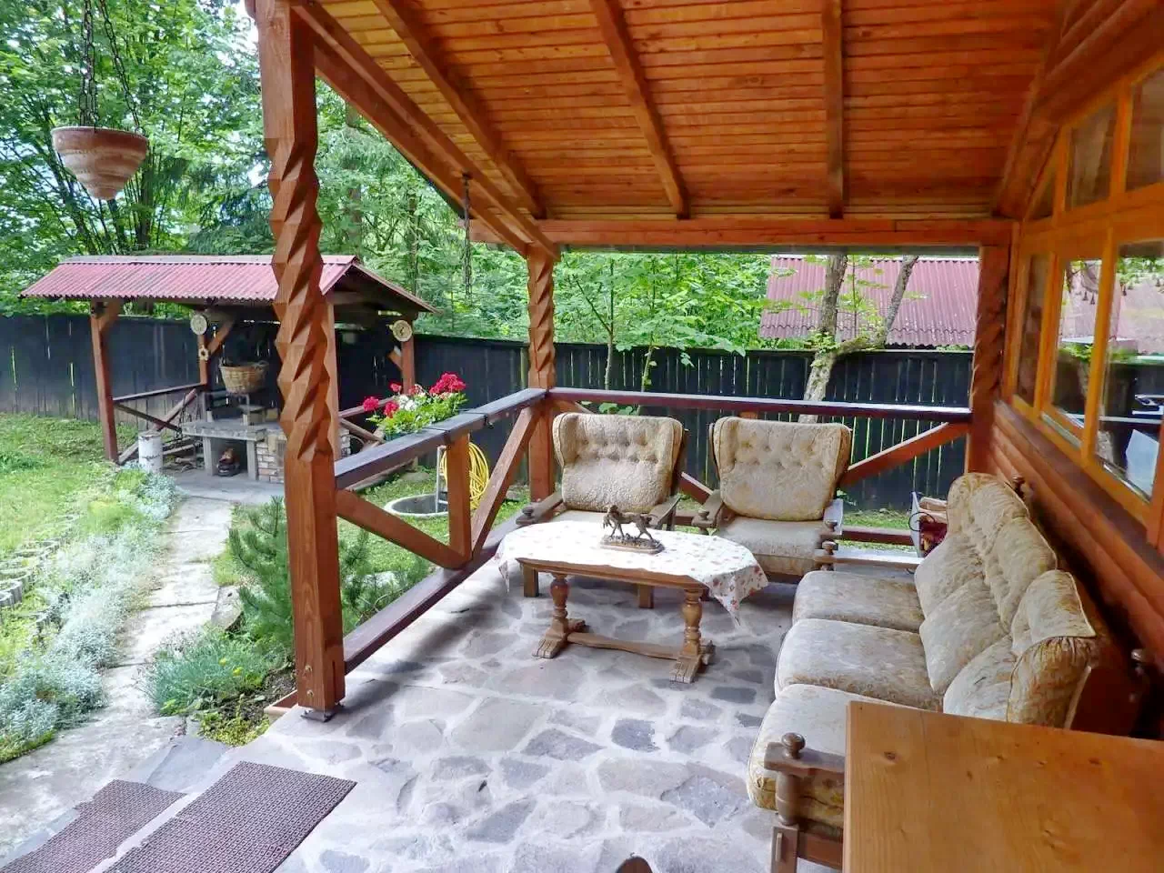 Foișor acoperit și terasă: Pentru relaxare și mese.