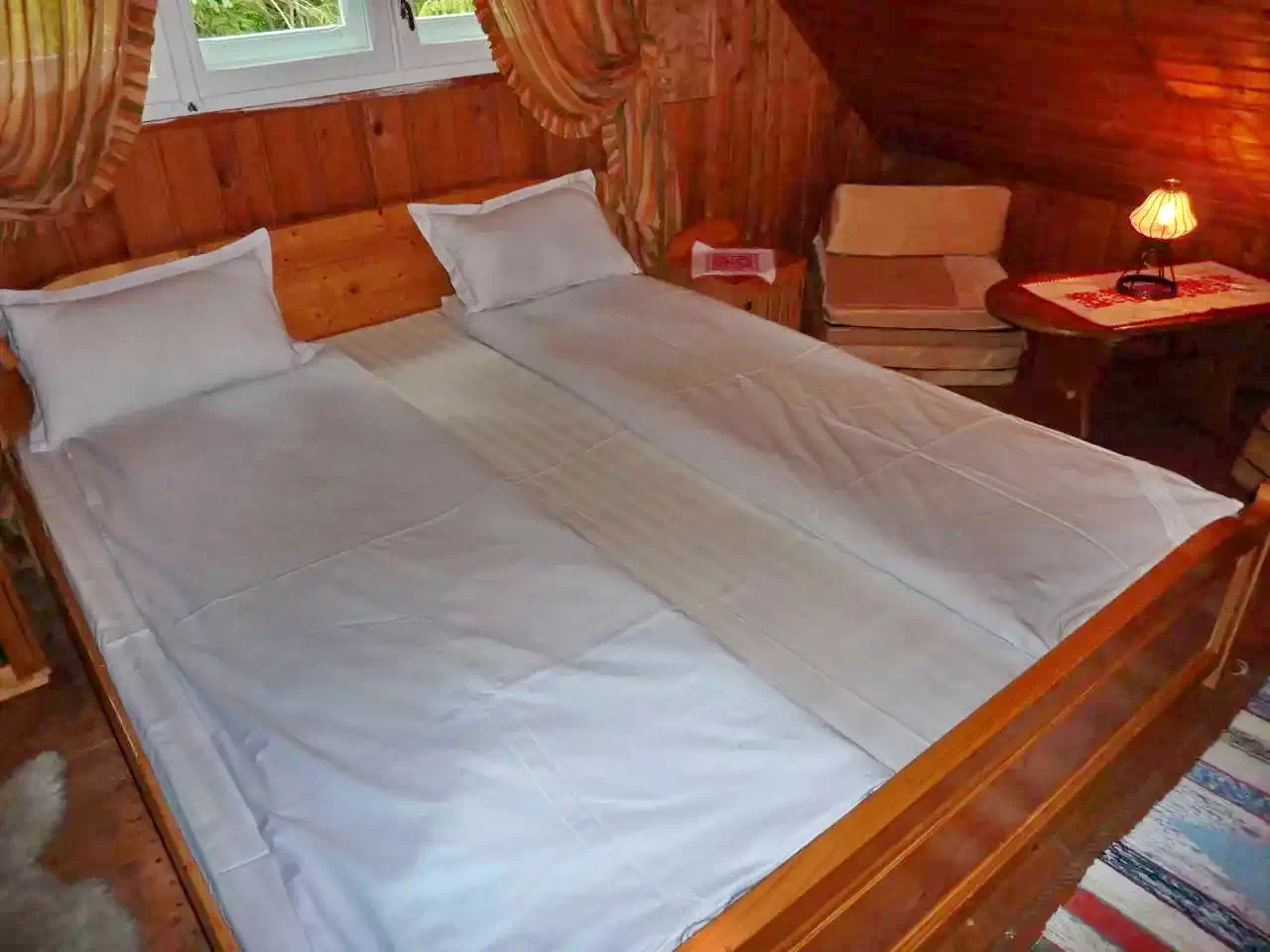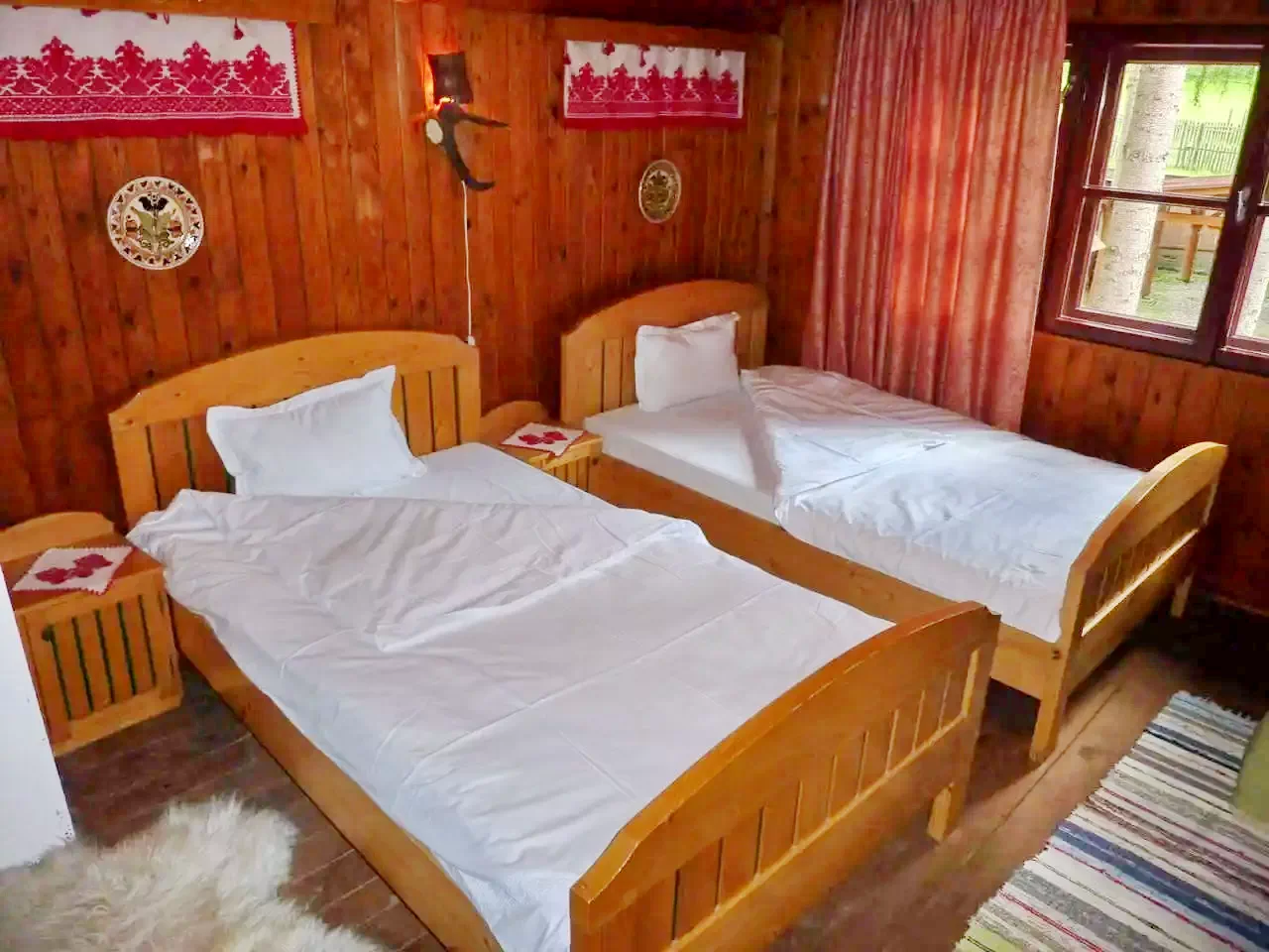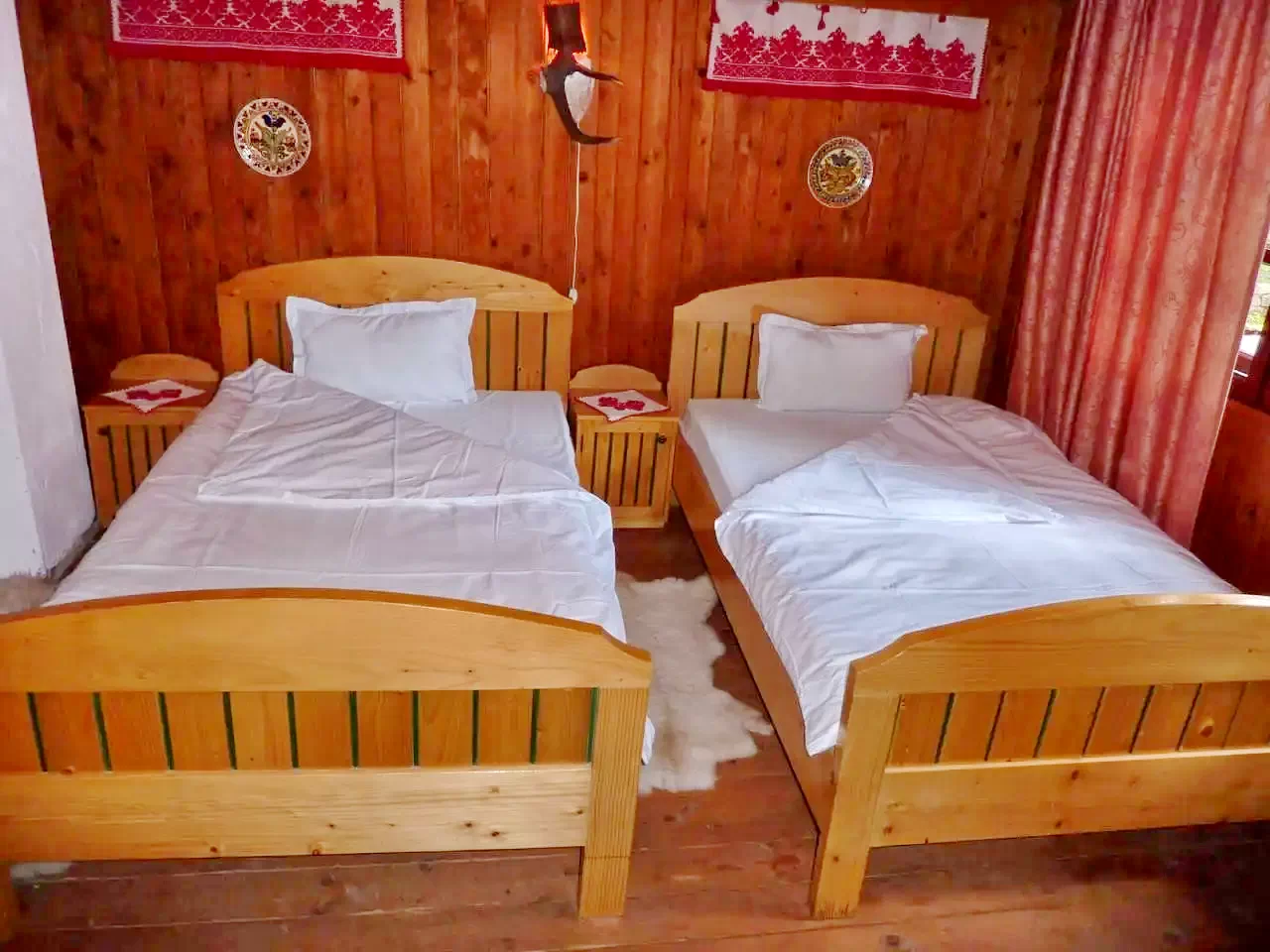 - La etaj, două camere primitoare așteaptă oaspeții: una cu un pat matrimonial, a doua cu două paturi single.
