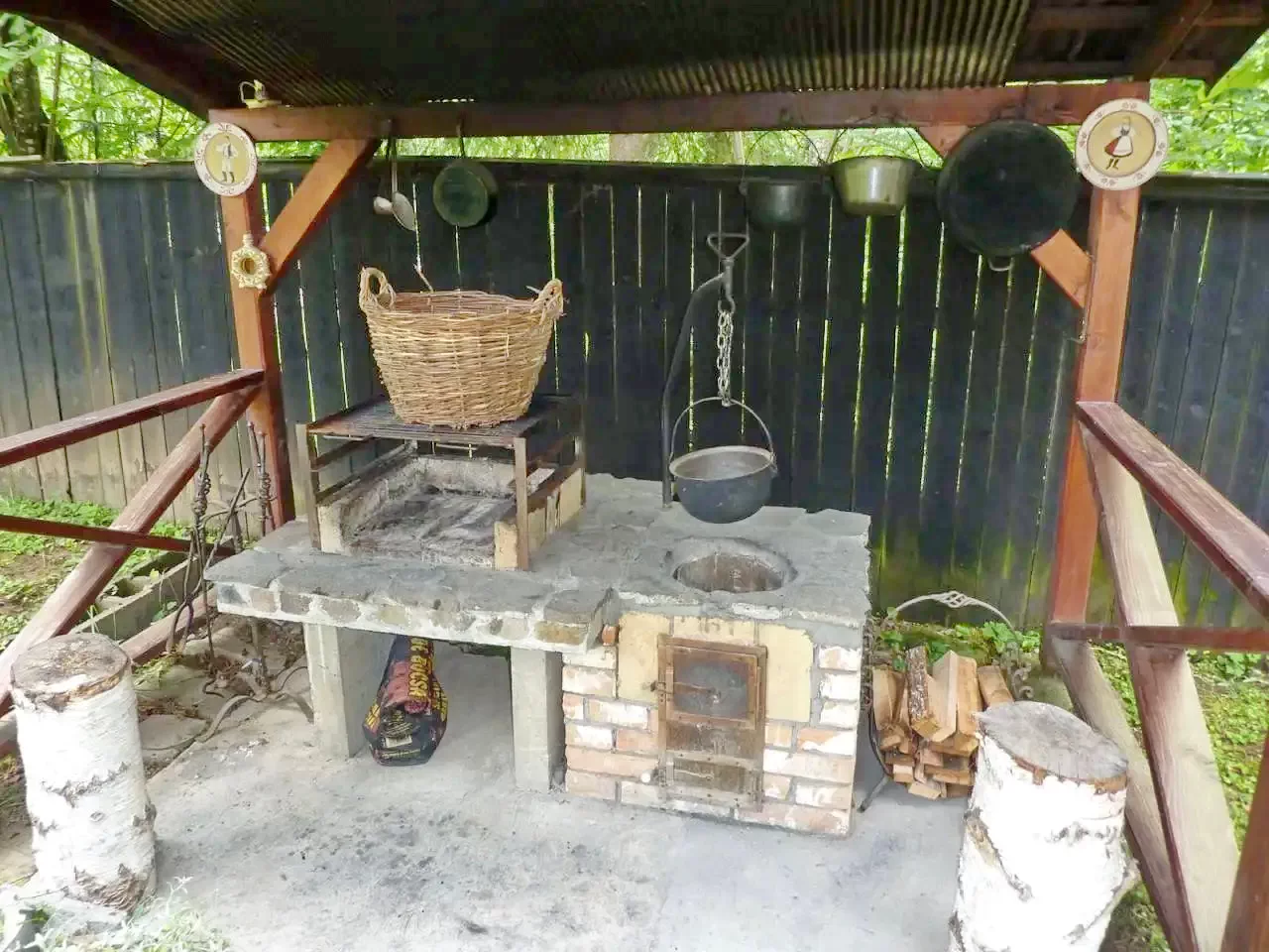 Gătit în aer liber: Cuptor pentru fripturi, ceaun, loc pentru foc.