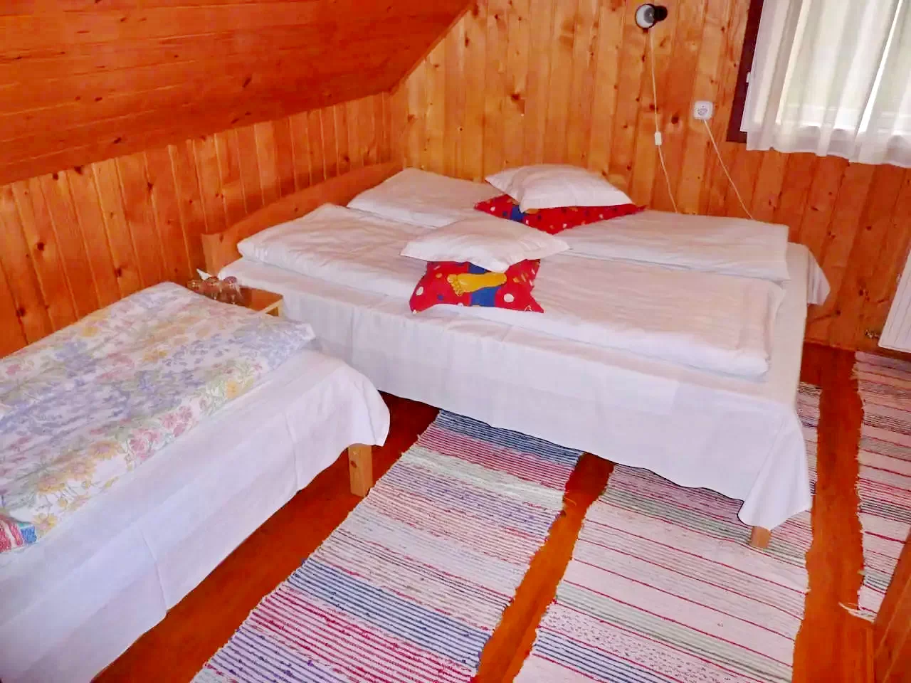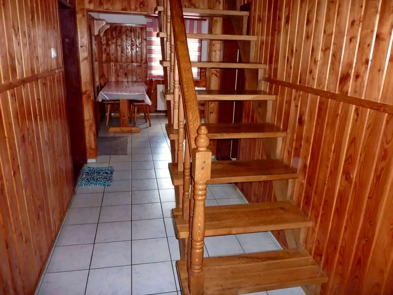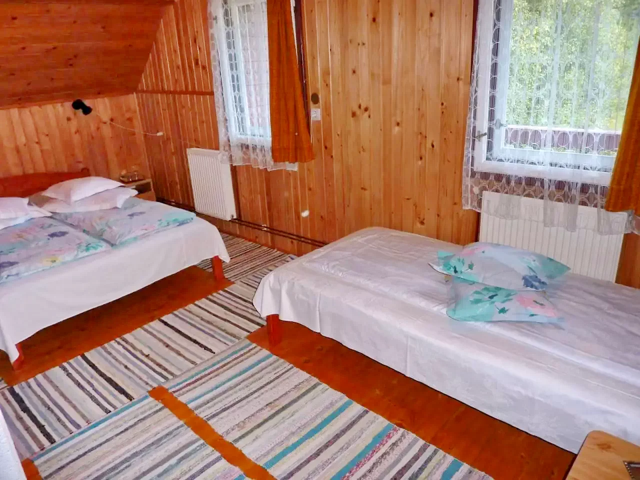 - La etajul doi sunt patru camere: una cu baie proprie (un pat dublu și un pat simplu), trei camere (două cu câte două paturi simple, una cu un pat dublu) cu baie comună pe coridor. O sală de mese separată, spațioasă, asigură confort suplimentar pentru grupuri mari.