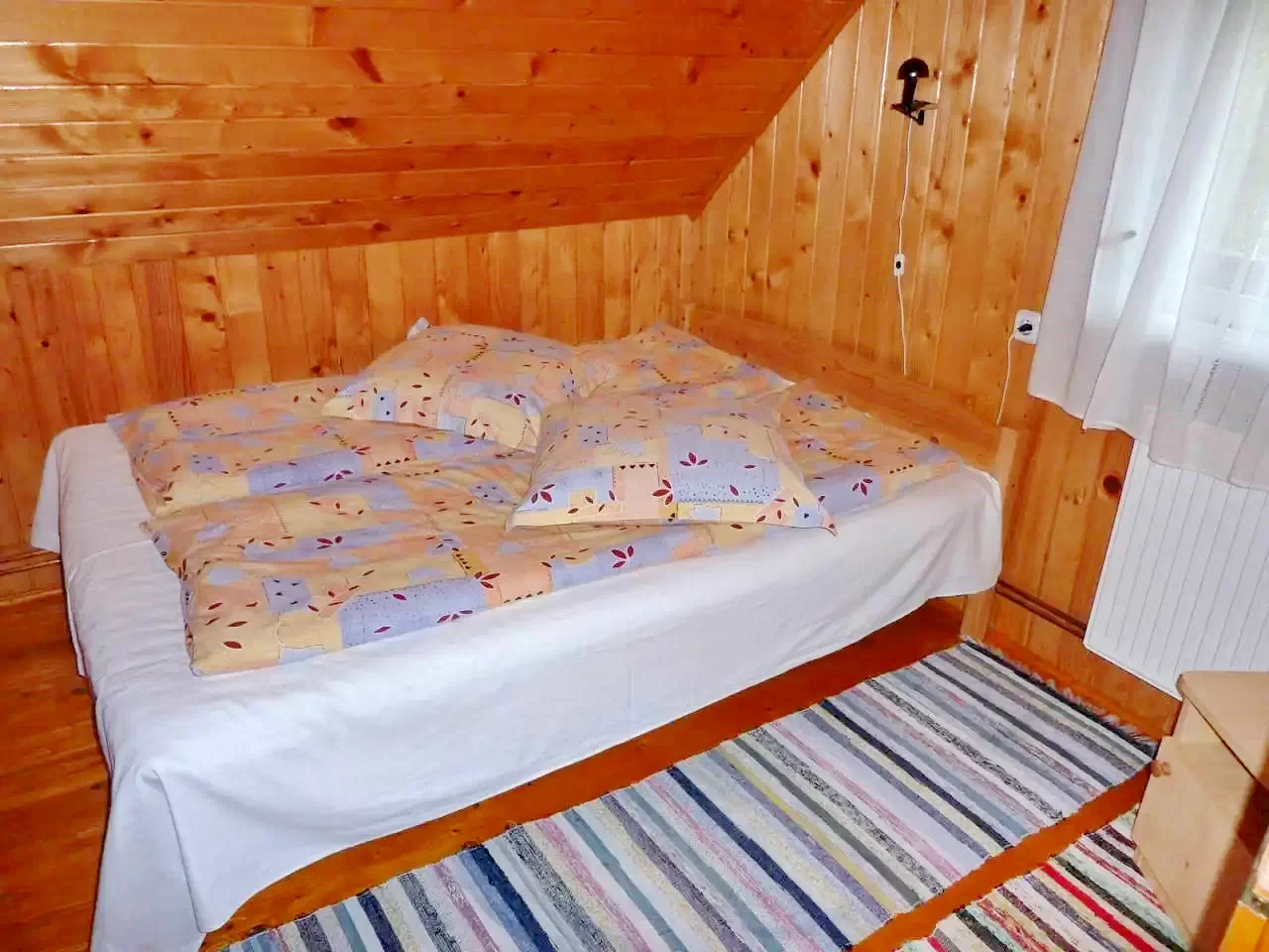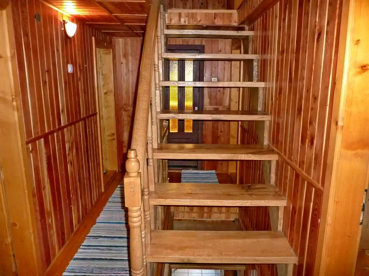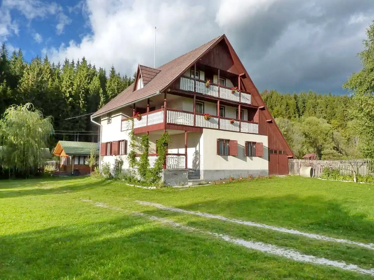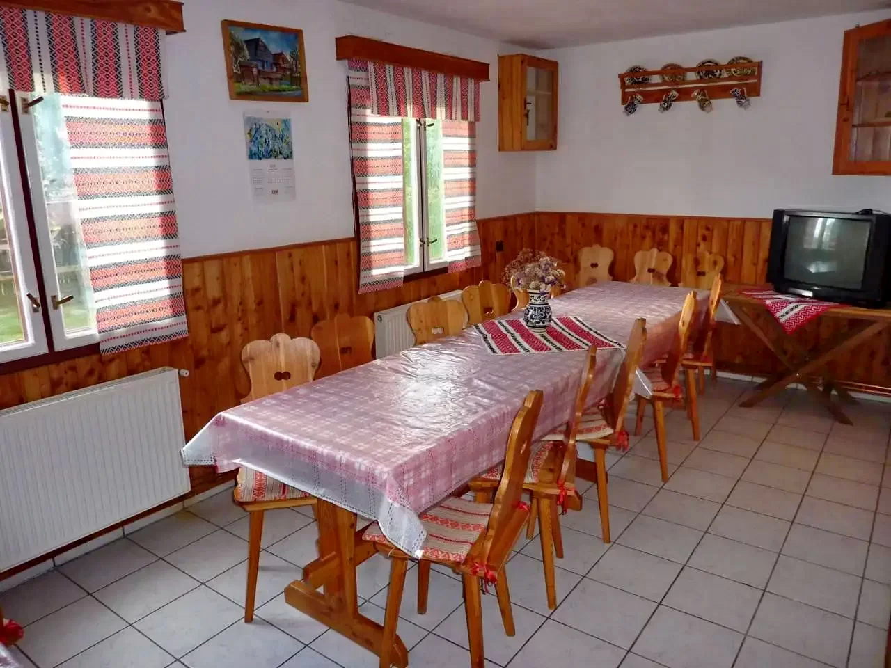 - La etajul doi sunt patru camere: una cu baie proprie (un pat dublu și un pat simplu), trei camere (două cu câte două paturi simple, una cu un pat dublu) cu baie comună pe coridor. O sală de mese separată, spațioasă, asigură confort suplimentar pentru grupuri mari.