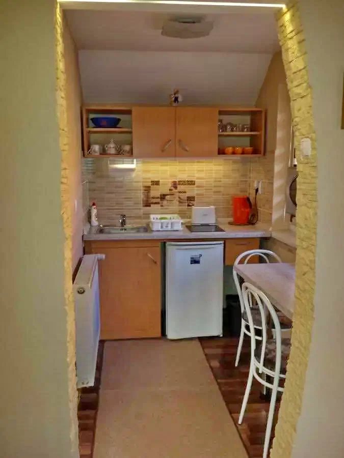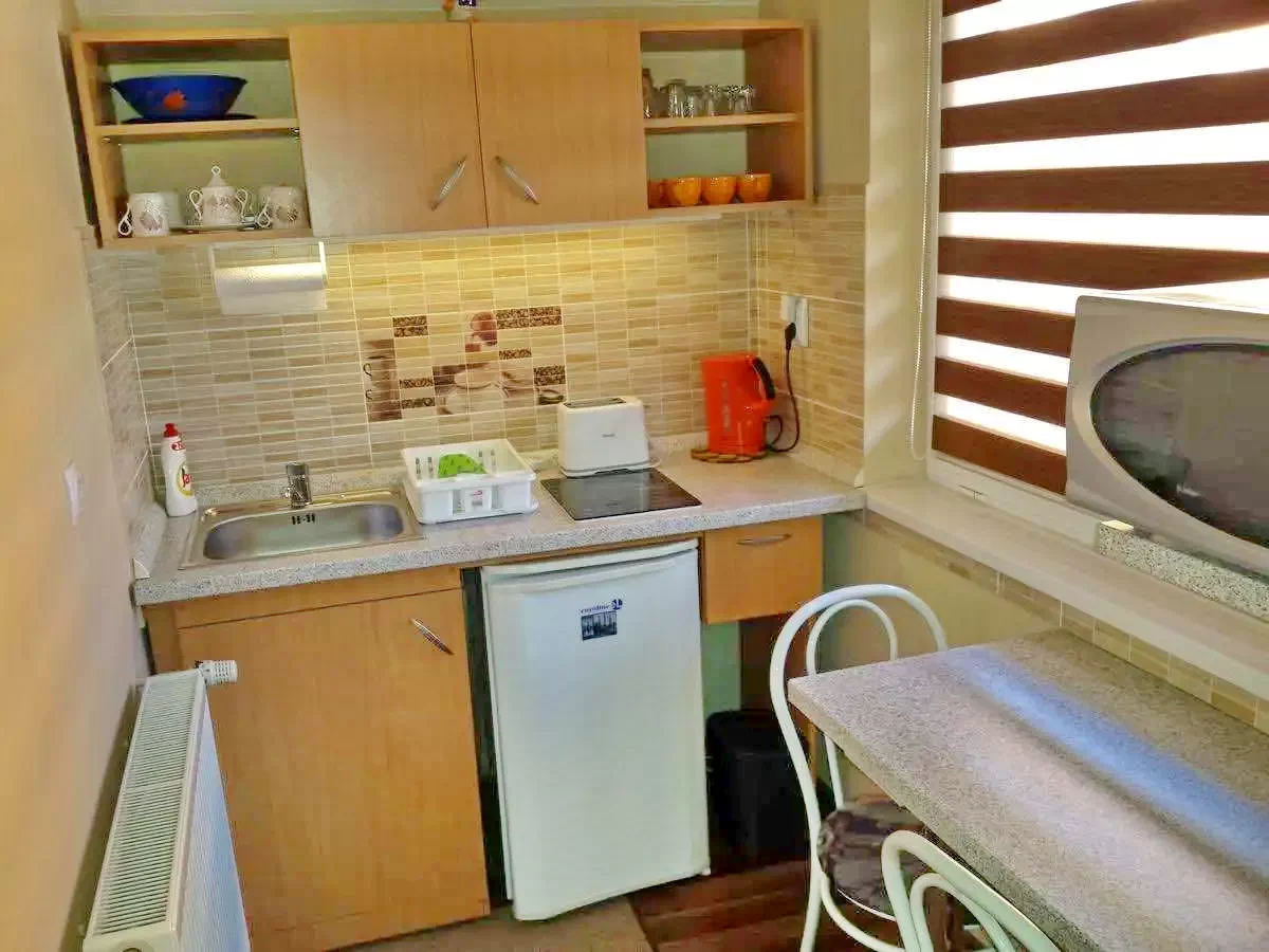 - Casa dispune de o bucătărie complet utilată la dispoziția oaspeților, cu aragaz pe gaz, frigider, plită cu inducție, prăjitor de pâine și cuptor cu microunde.