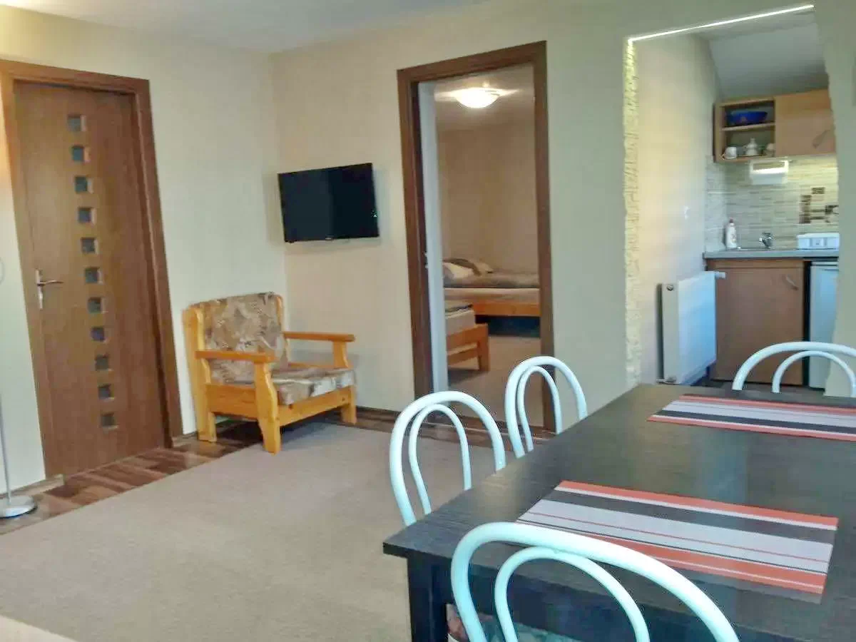 - Living: Canapea extensibilă, televizor cu ecran plat și masă de dining.
