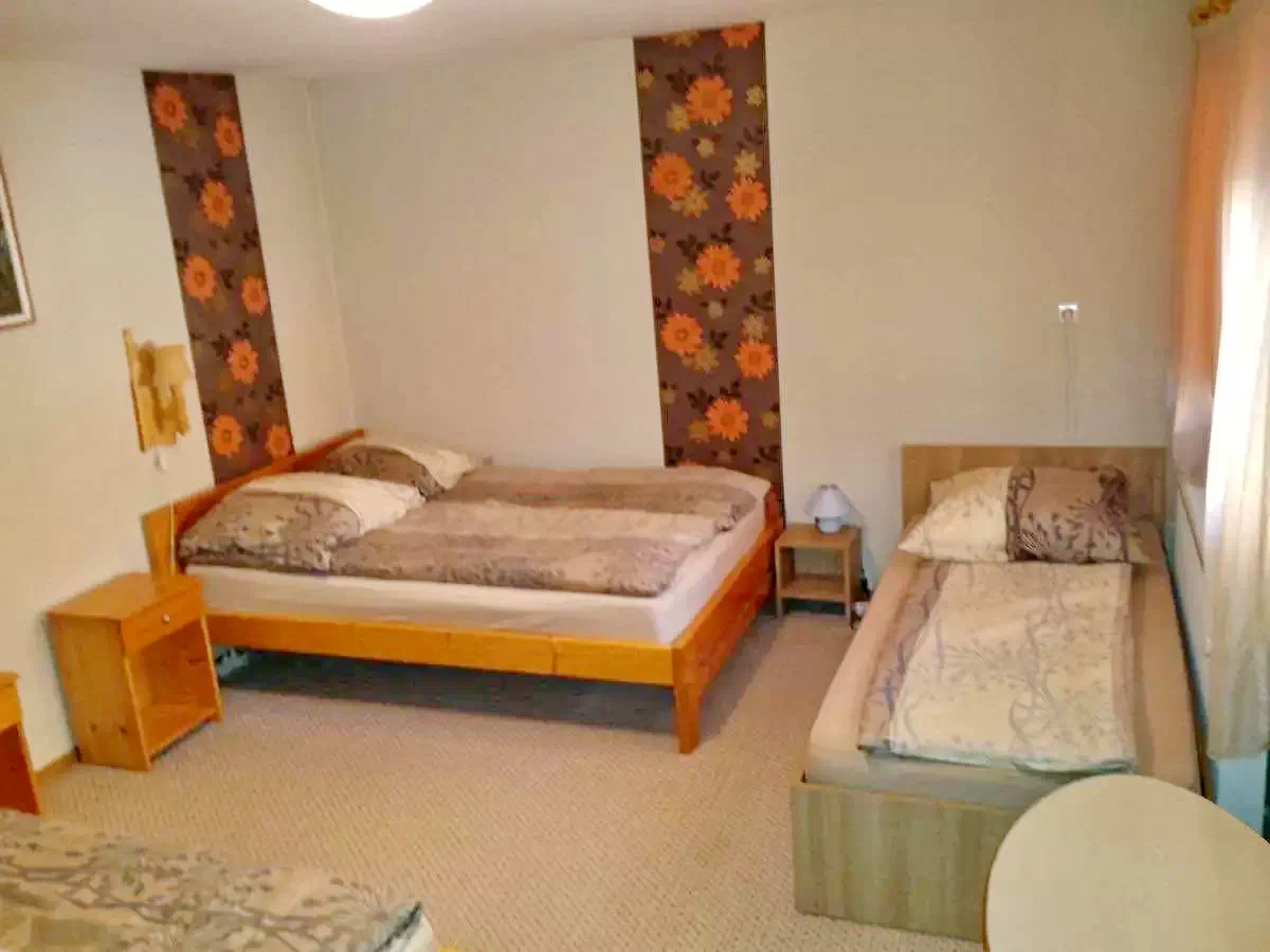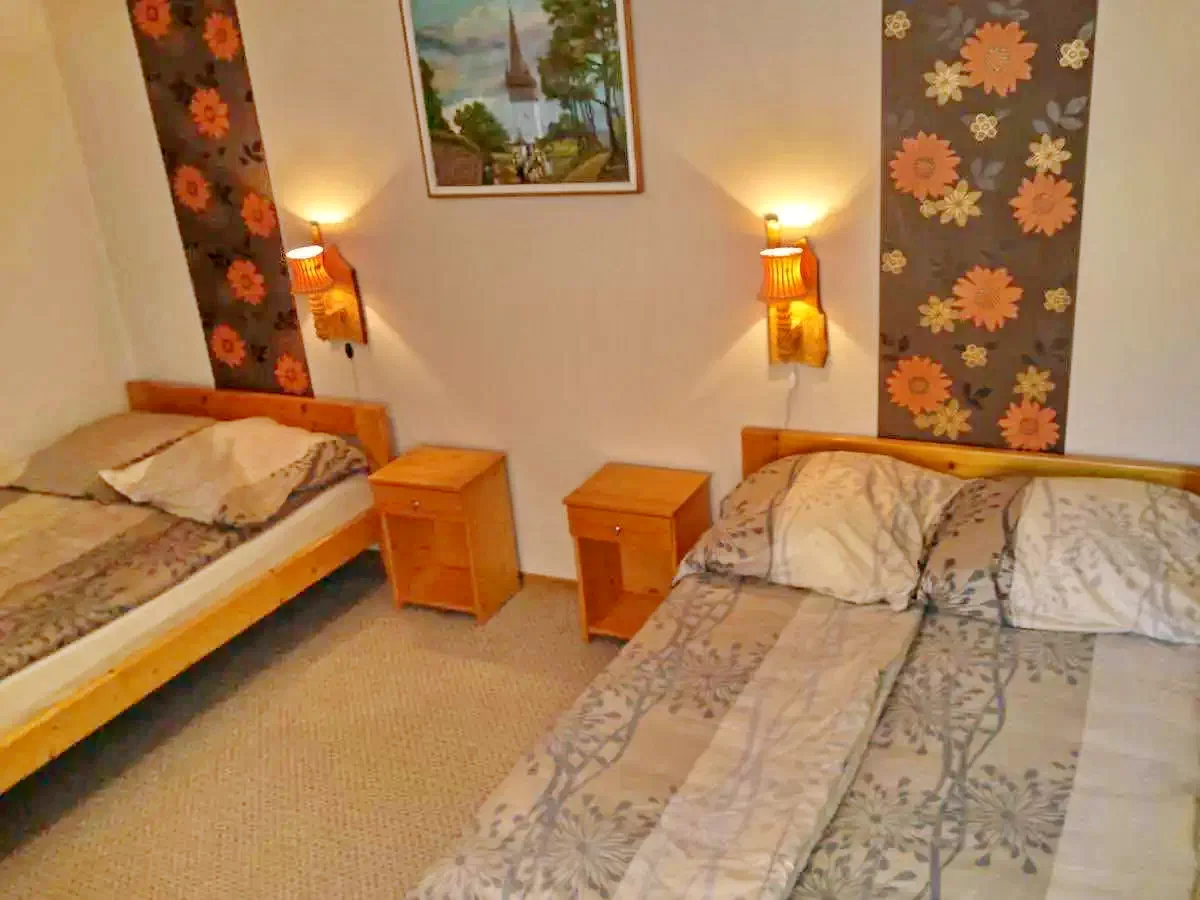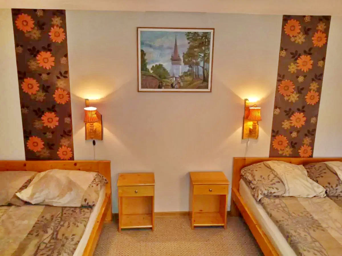 - La parter se află o cameră cu două paturi matrimoniale și televizor.