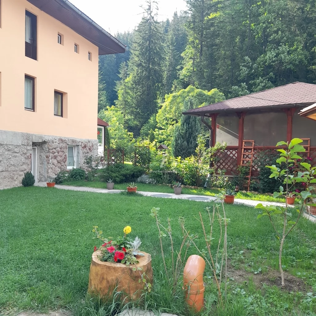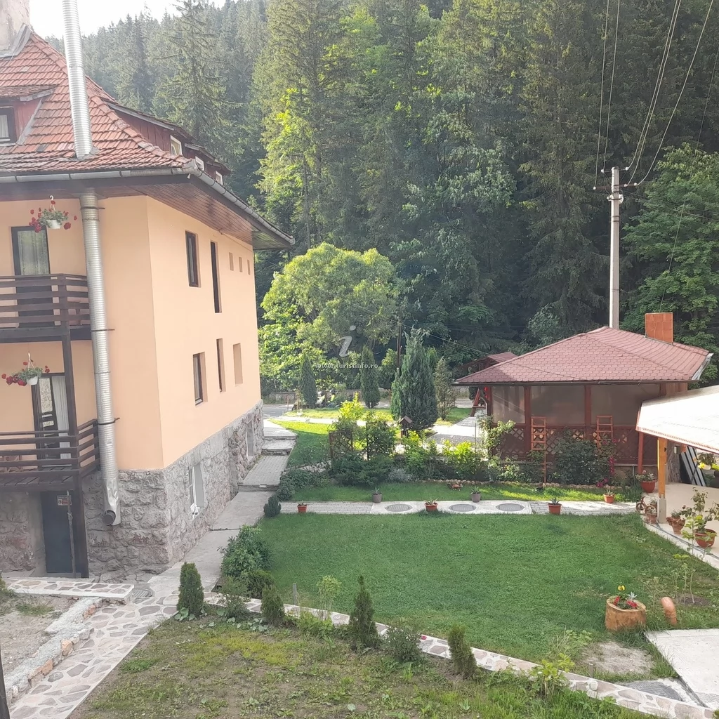 - Curtea pensiunii este amenajată cu foișor, mobilier de grădină, facilități pentru grătar și ceaun, loc de joacă pentru copii și parcare privată.
