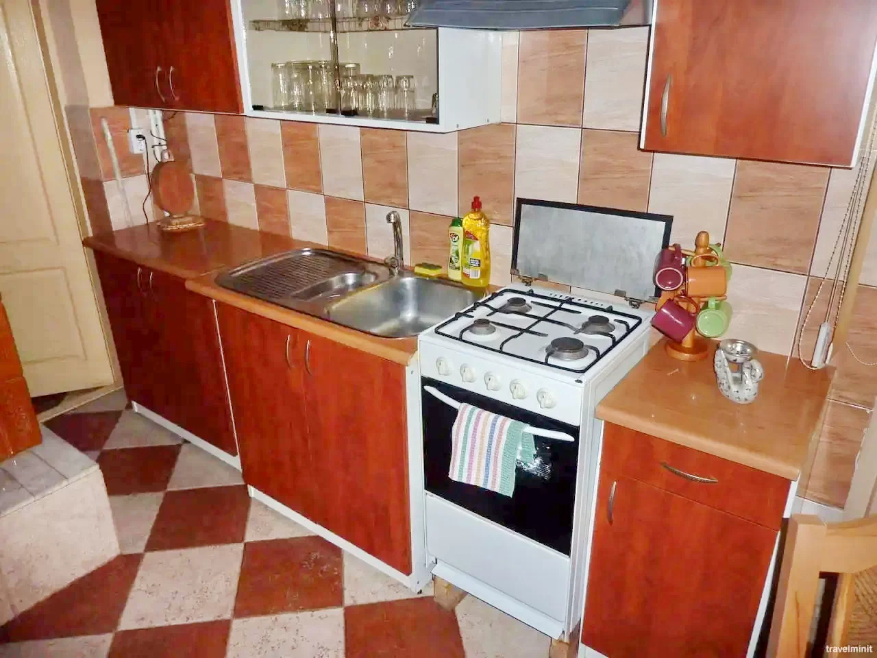 Echipamente de bucătărie: Aragaz pe gaz, frigider, filtru de cafea, vase, tacâmuri.
