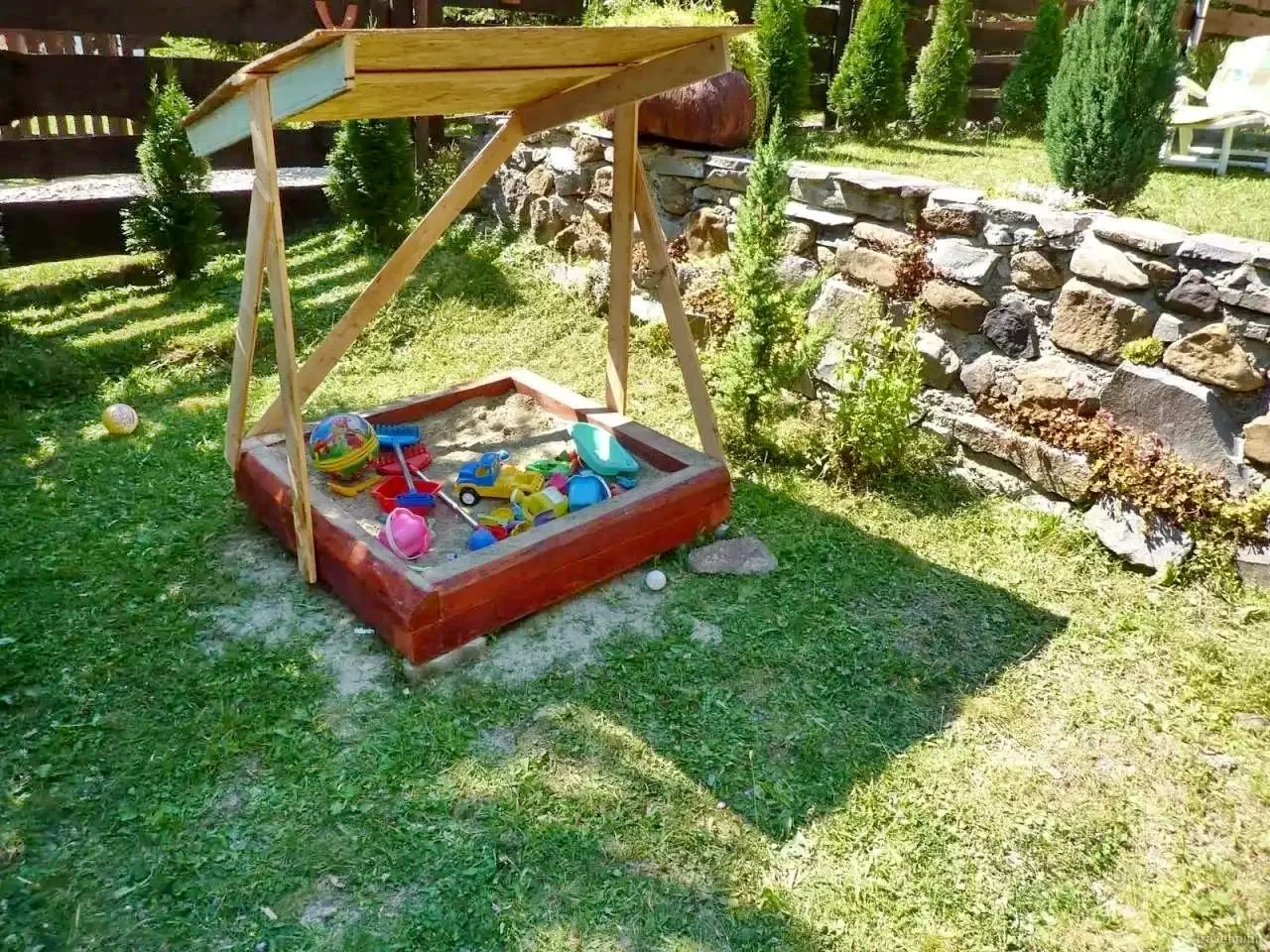Relaxare: Foișor acoperit, terasă, șezlonguri, leagăn, groapă cu nisip.