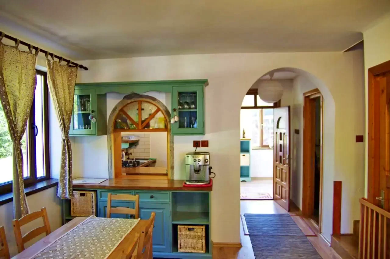 Are o sufragerie pentru 15 persoane, 2 bucătarii utilate si un living spațios.