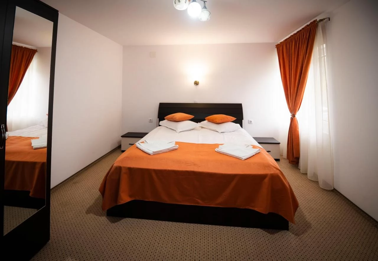 - Oferă cazare in 5 camere duble cu pat matrimonial, cu televizor, cablu, internet wireless, baie proprie cu apa calda non stop si încălzire centrala.