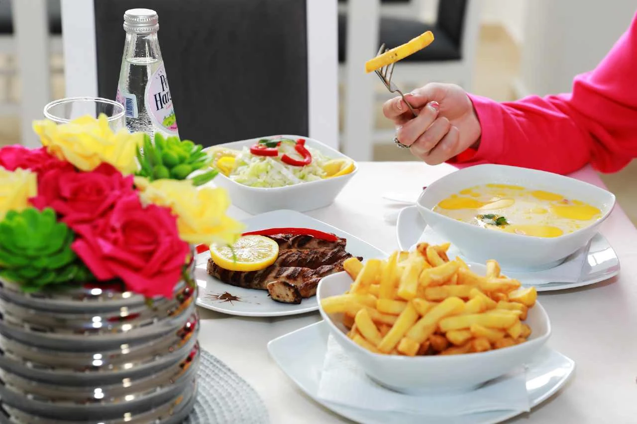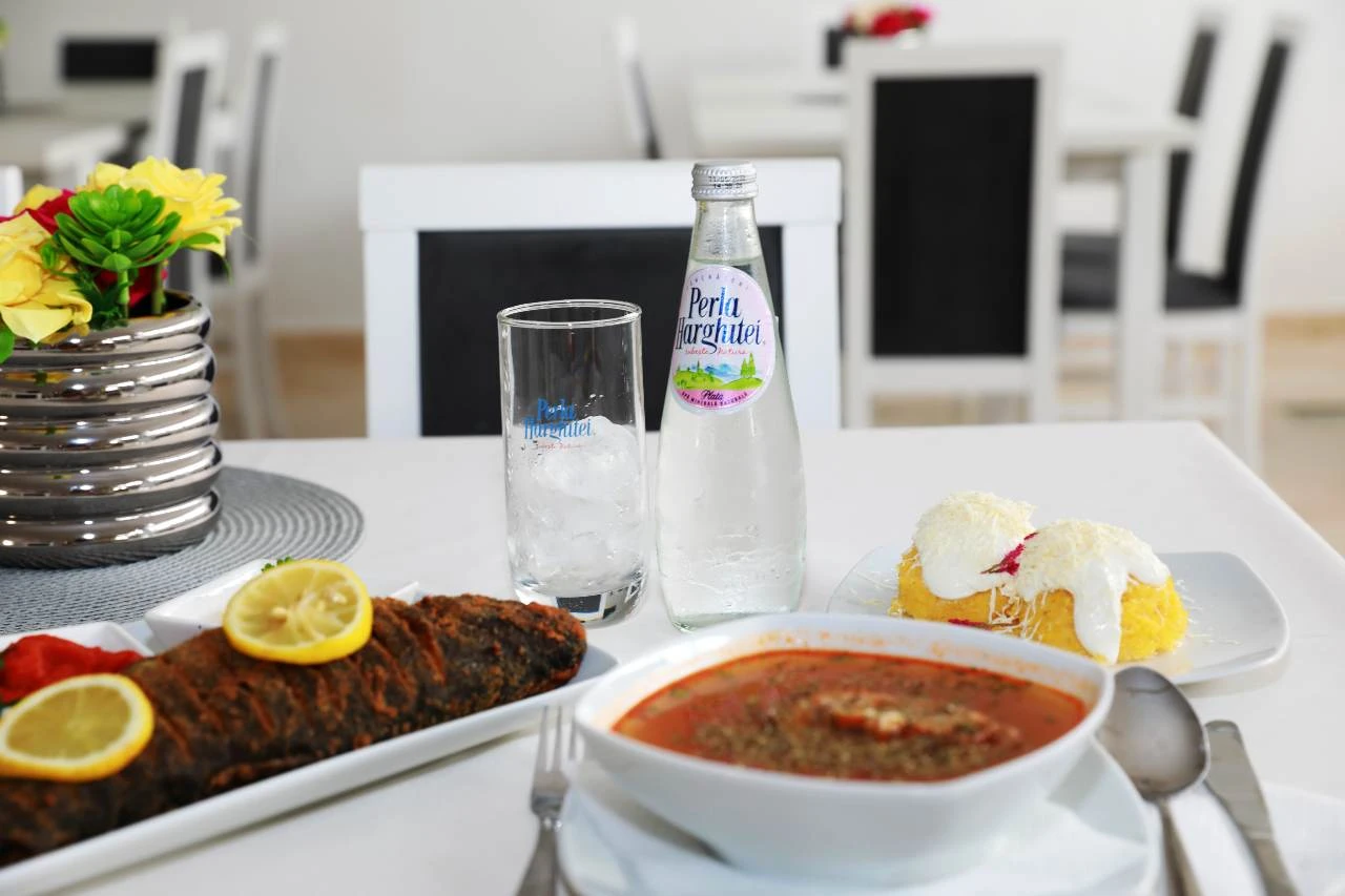 - Meniul include preparate à la carte, unde specialitățile din pește predomină, dar oaspeții se pot bucura zilnic, între orele 08:00 și 22:00, de un meniu variat și delicios.