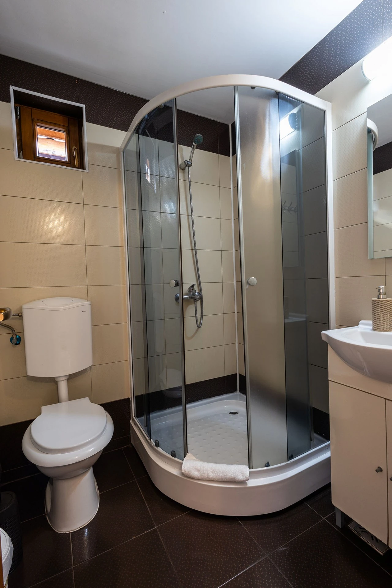 - fiecare camera poate găzdui 4 persoane (1 pat dublu matrimonial, 2 paturi de o persoană) și este dotată cu o baie privată