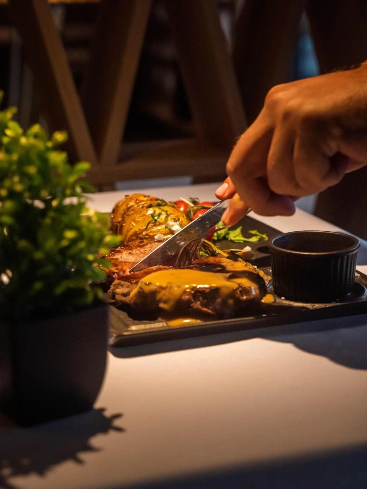 - Într-un ambient rustic, dar rafinat, oaspeții pot savura preparate realizate din ingrediente locale proaspete, incluzând și opțiuni vegetariene.