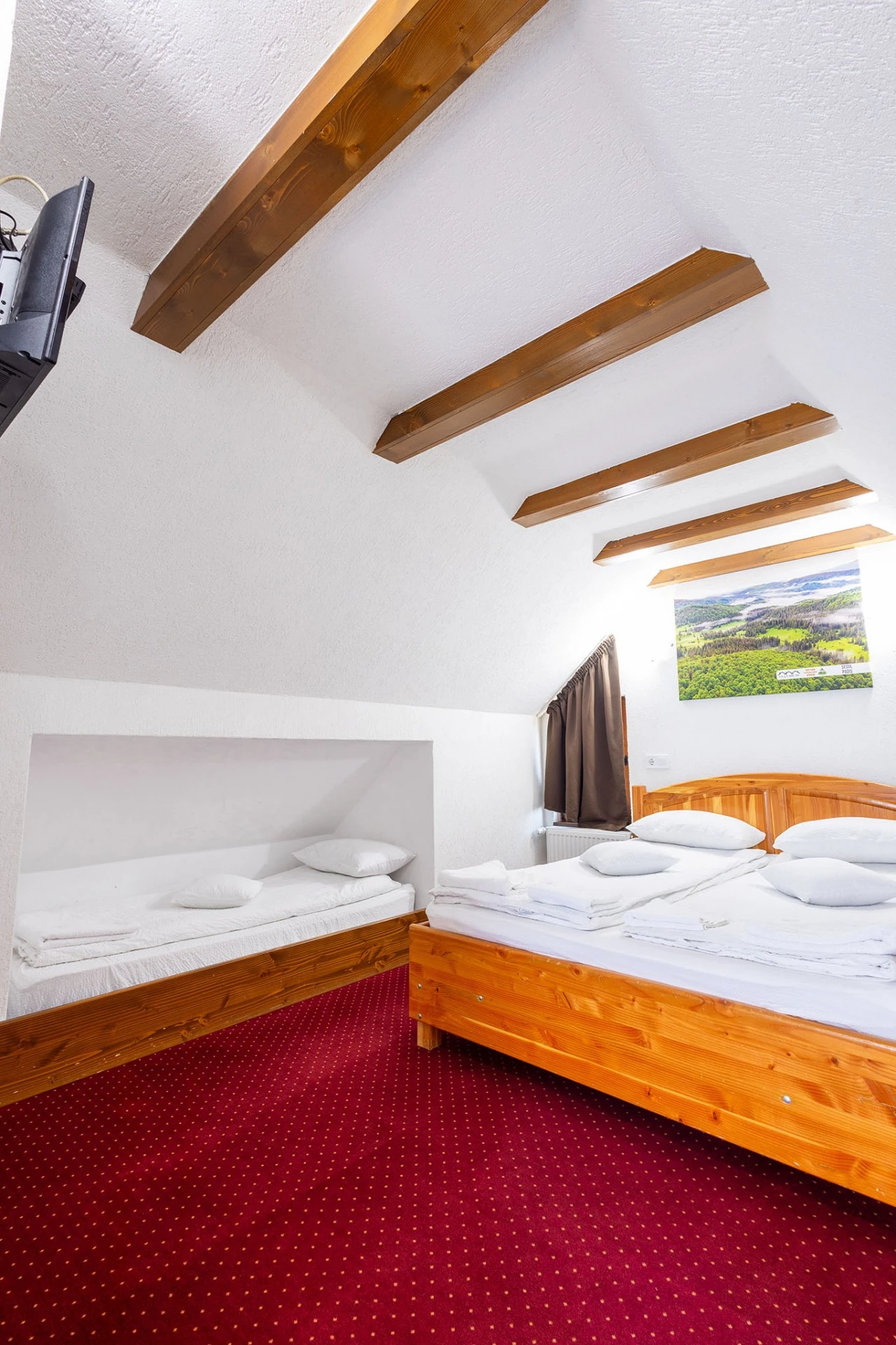 - fiecare camera poate găzdui 4 persoane (1 pat dublu matrimonial, 2 paturi de o persoană) și este dotată cu o baie privată
