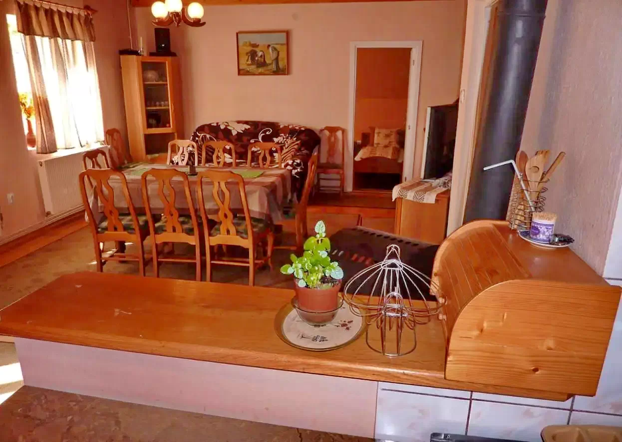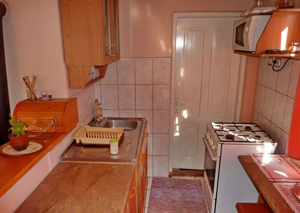 - Bucătăria complet echipată a casei răspunde tuturor nevoilor: aragaz pe gaz, frigider, cuptor cu microunde, cafetieră, fierbător de apă, vase și tacâmuri.