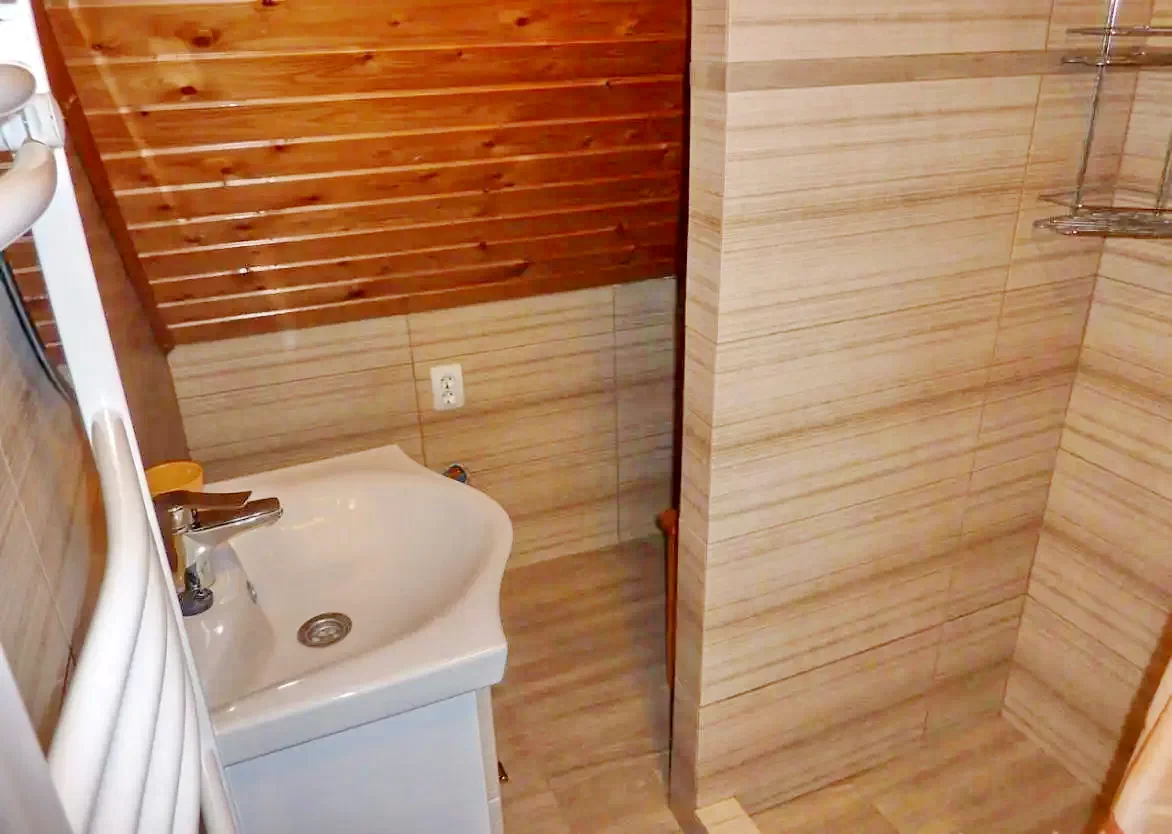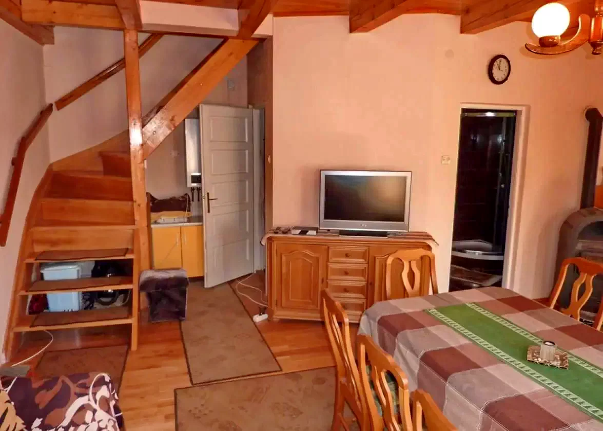- La parter se află un living-sufragerie spațios, o bucătărie complet echipată, o baie cu duș, un WC separat și o cameră cu două paturi matrimoniale.