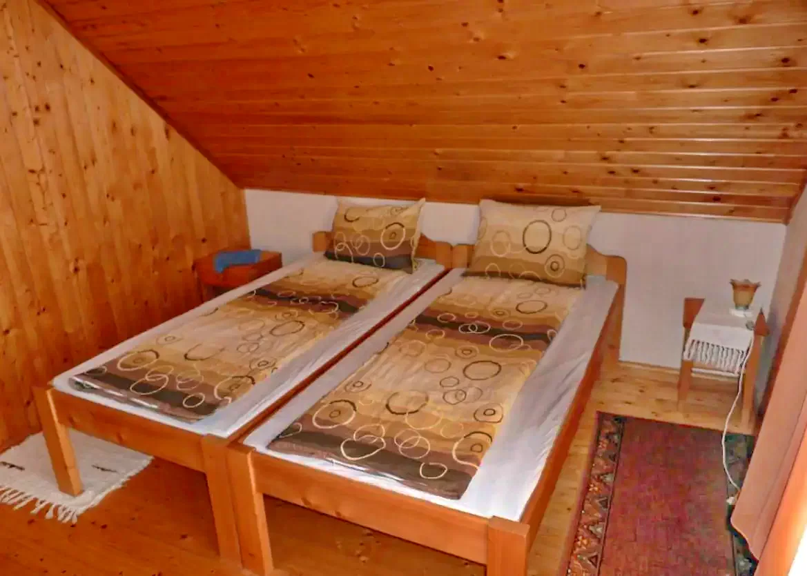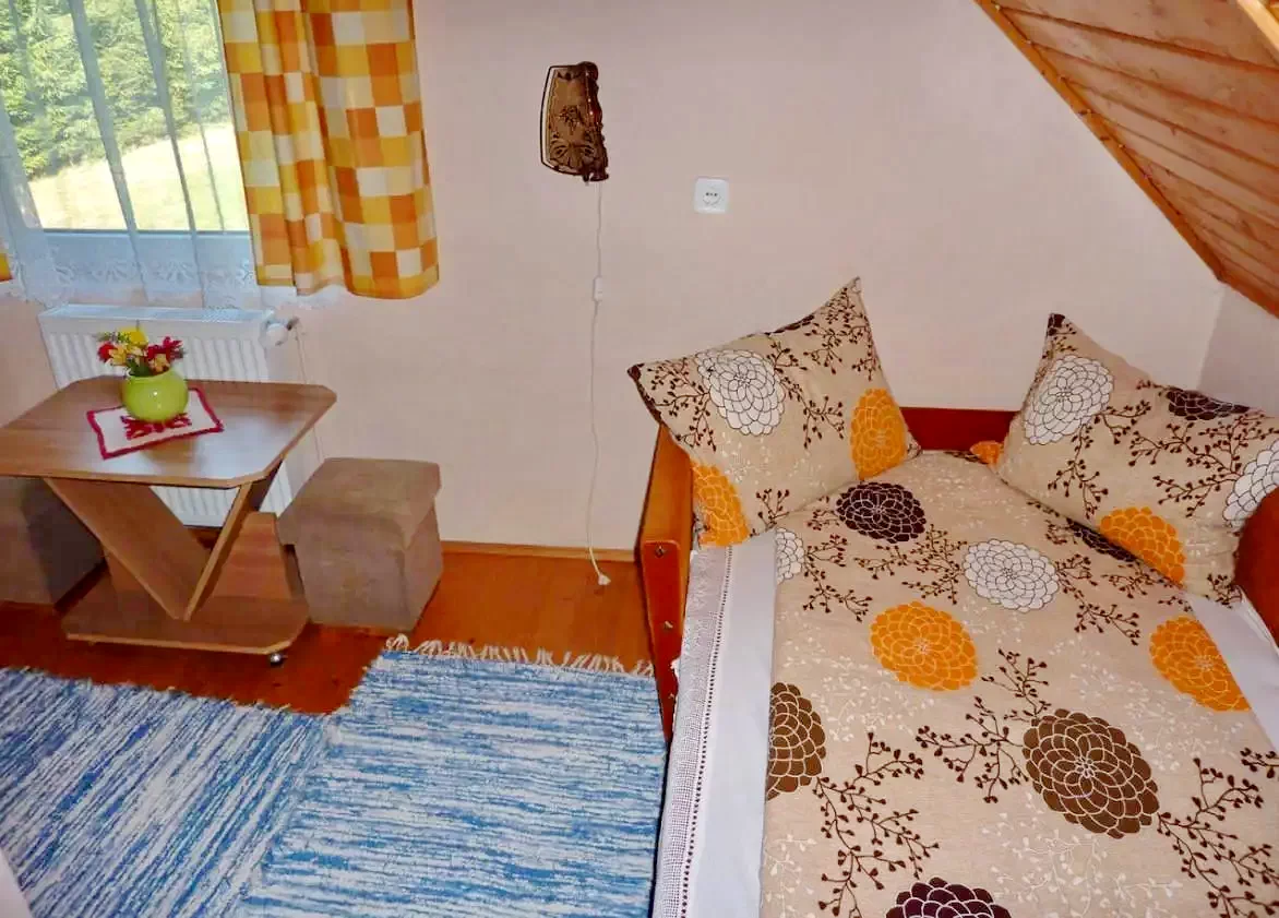 - Etaj: 2 camere duble (cu paturi unite sau separate – 4 locuri) și 1 cameră single (1 loc)