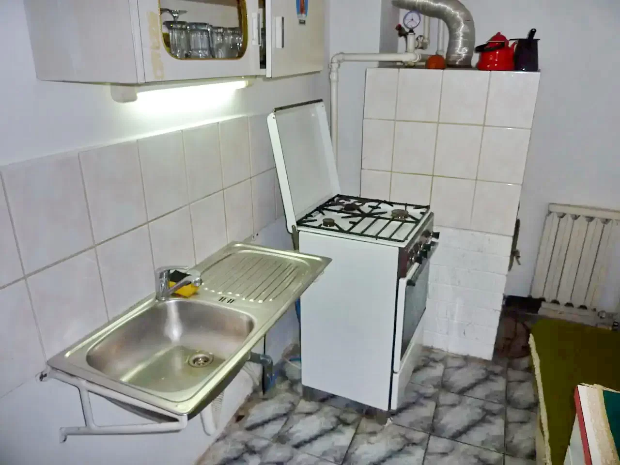 Bucătărie complet utilată (aragaz pe gaz, frigider, cuptor cu microunde, cafetieră, vase, tacâmuri)