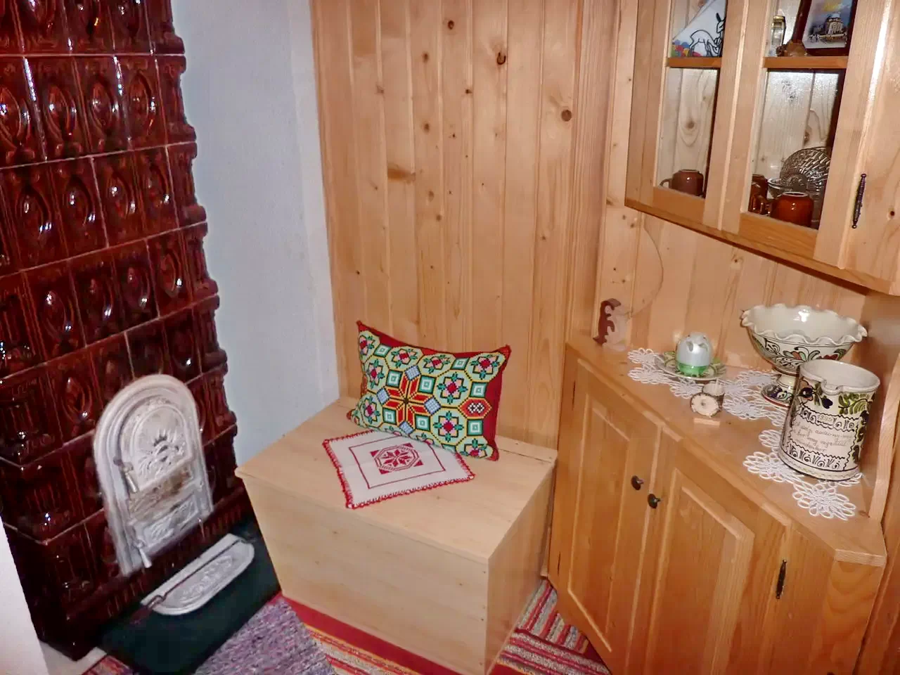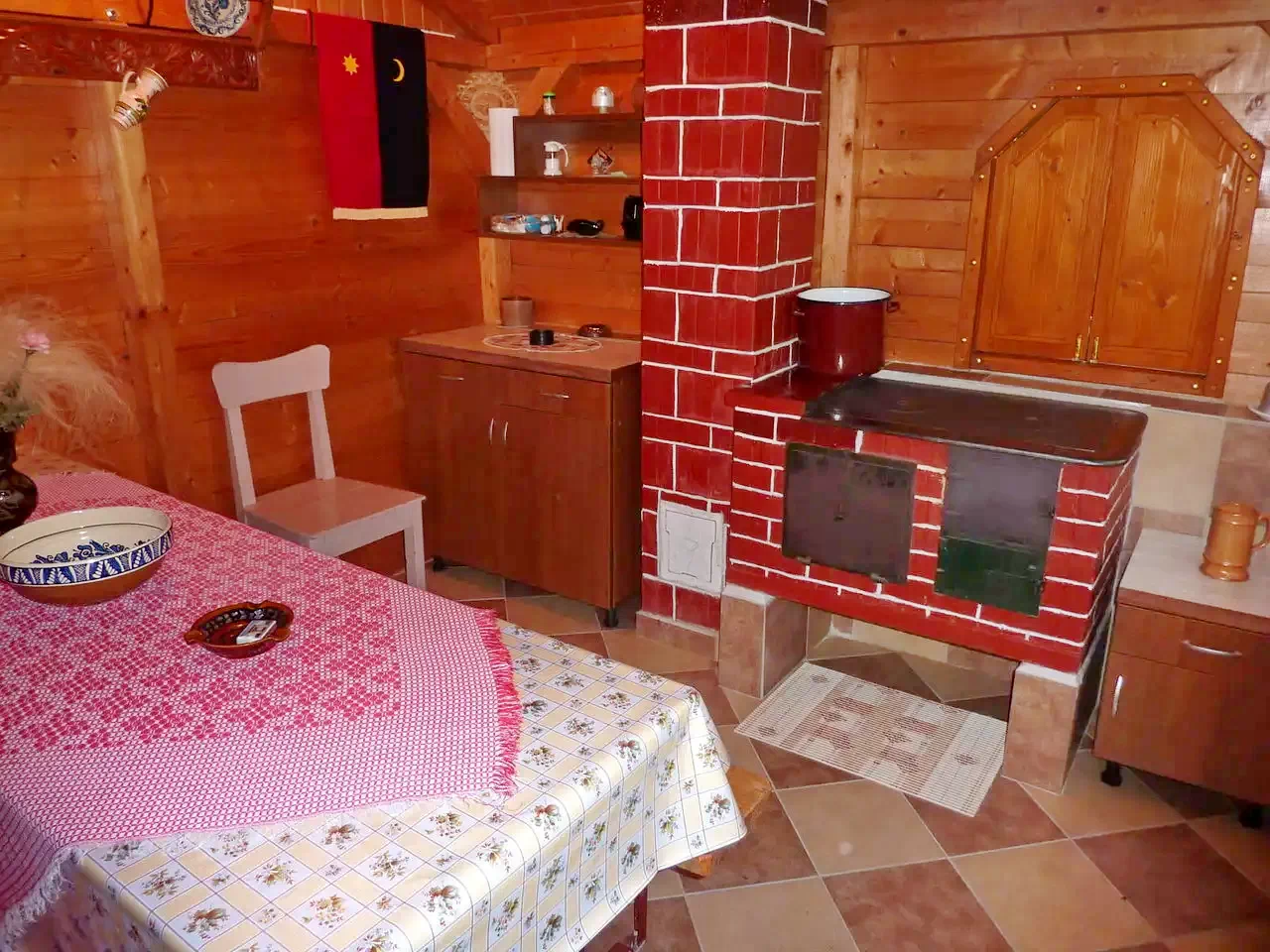 - Casa este încălzită cu sobă de teracotă, oferind căldură plăcută iarna, iar apa caldă este furnizată electric.