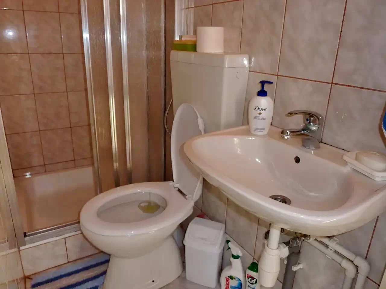 - Baie cu duș, toaletă cu rezervor și lavoar