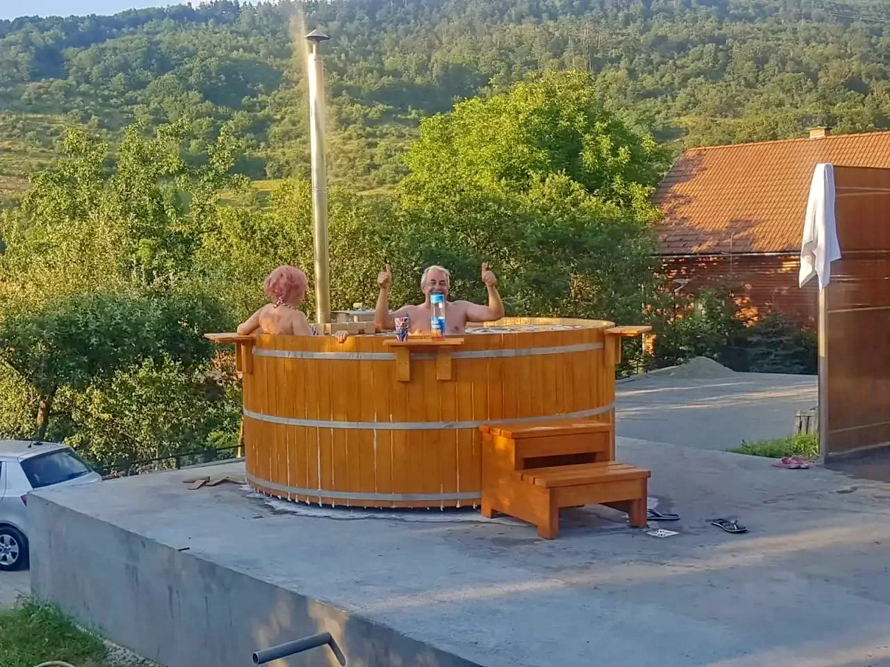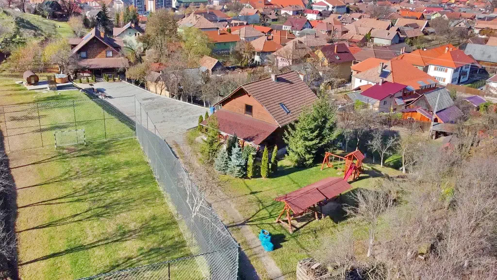 - Gradina mare cu foisor, gratar, loc de parcare, teren de joaca pentu copii cu topogan, leagan, casuta mica, sauna si ciubar, foisor acoperit cu gratar si teren de sport.