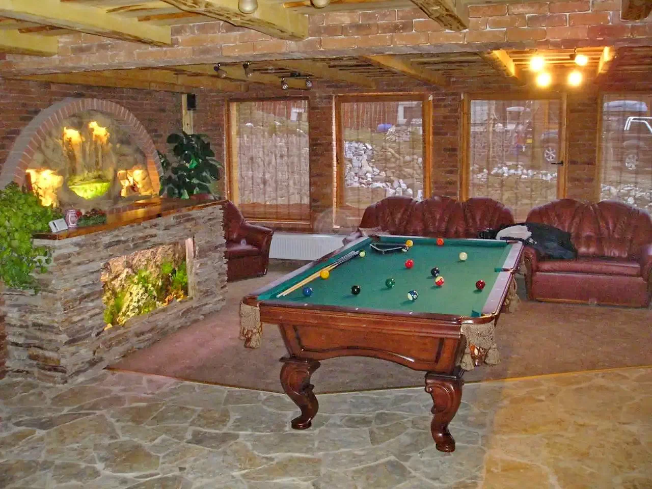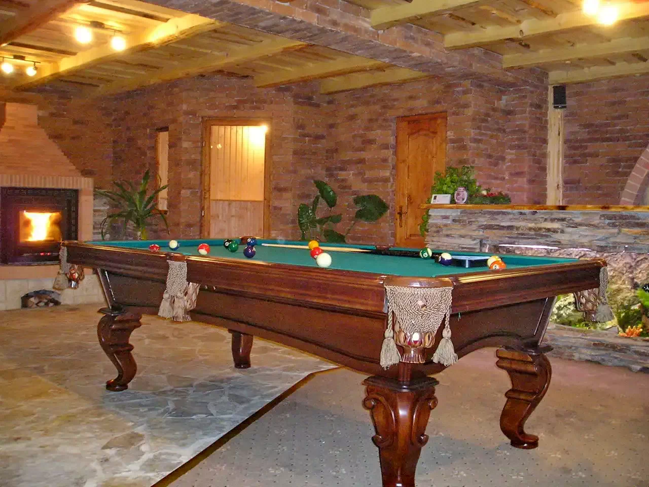 - Living: șemineu, sistem home cinema, masa de biliard