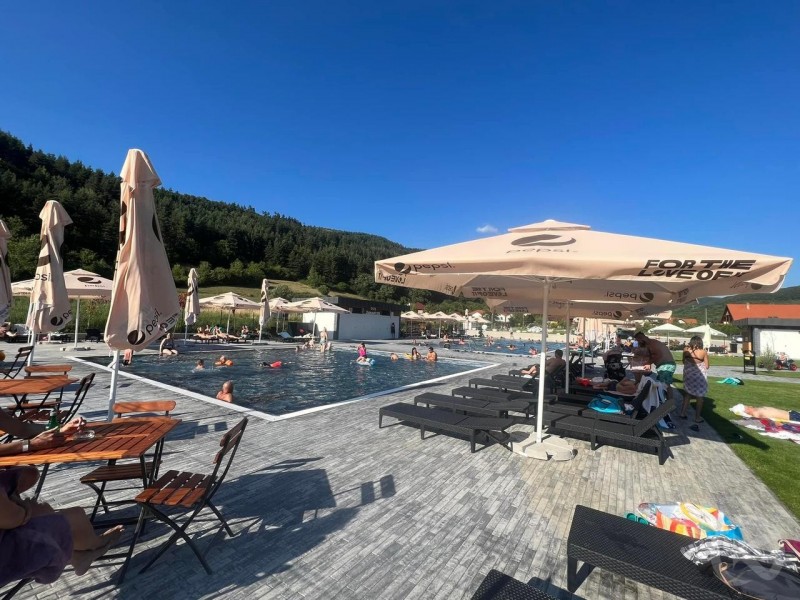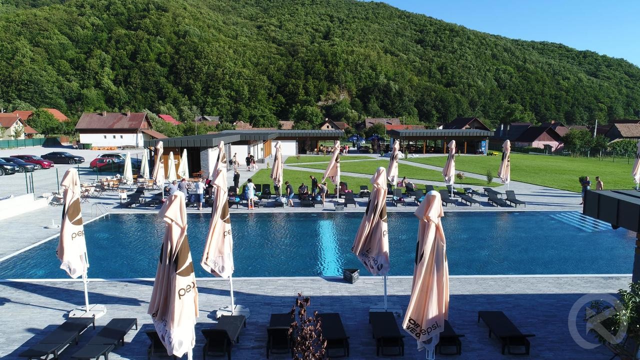 - În curtea pensiunii se află o piscină în aer liber și o cadă cu apă sărată, încălzită, pentru 6 persoane, înconjurată de șezlonguri și leagăne.