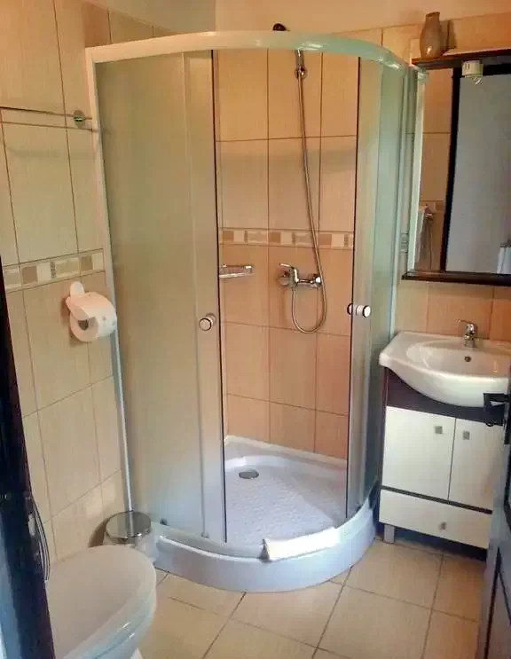 Fiecare cameră are baie proprie externă (1 cameră la parter, 2 camere la etaj).